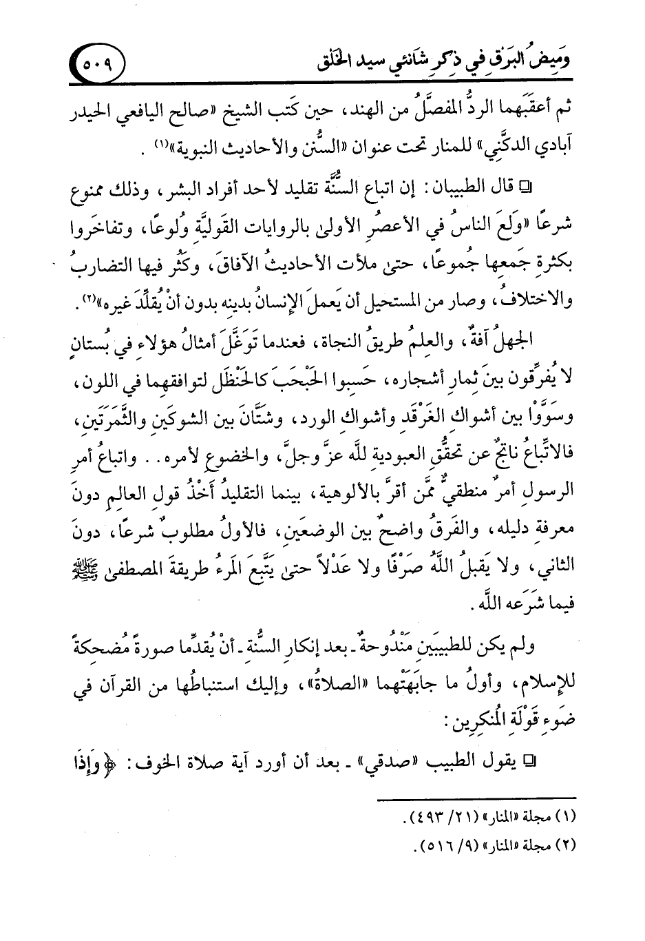 ° قال الطبيبان: إن اتباع السُّنَّة تقليد لأحد أفراد البشر، وذلك ممنوع شرعًا "وَلعَ الناسُ في الأعصُرِ الأولى بالروايات القَوليَّةِ وُلوعًا، وتفاخَروا بكثرةِ جَمعِها جُموعًا، حتى ملأت الأحاديثُ الآفاقَ، وكَثُر فيها التضاربُ والاختلافُ، وصار من المستحيل أن يَعملَ الإِنسانُ بدينِه بدون أنْ يُقلِّدَ غيره" (¬2).