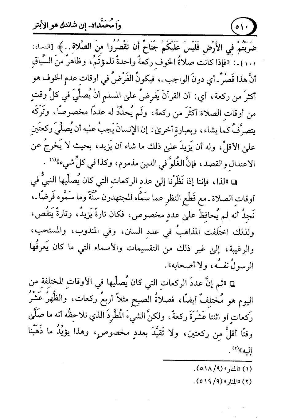 ° "لذا، فإننا إذا نَظَرْنا إلى عددِ الركعاتِ التي كان يُصلِّيها النبيُّ في أوقاتِ الصلاة -مع قَطْعِ النظرِ عما سَمَّاه المجتهدون سُنَّةً وما سَمَّوه فَرضًا-، نَجِدُ أنه لم يُحافِظْ على عددٍ مخصوص، فكان تارةً يَزيدُ، وتارةً يَنقُص، ولذلك اختَلفت المذاهبُ في عددِ السنن، وفي المندوب، والمستحب، والرغيبة، إلى غير ذلك من التقسيمات والأسماء التي ما كان يَعرفُها الرسولُ نفسُه، ولا أصحابه".
