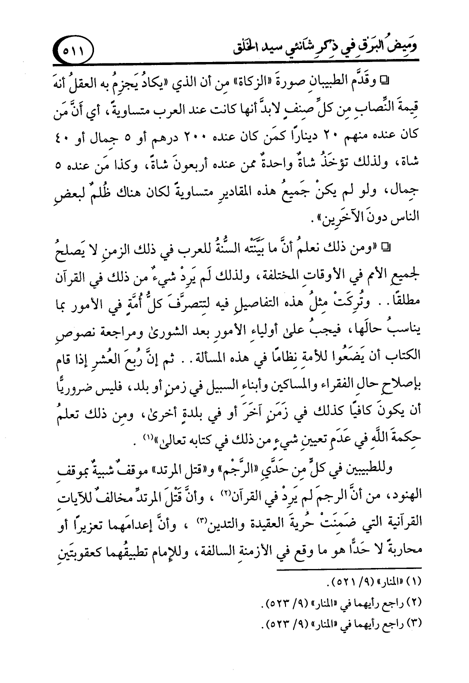 ° "ومن ذلك نعلمُ أن ما بَيَّنَتْه السُّنةُ للعرب في ذلك الزمنِ لا يَصلحُ لجميع الأمم في الأوقاتِ المختلفة، ولذلك لَم يَرِدْ شيءٌ من ذلك في القرآن مطلقًا .. وتُرِكَتْ مِثلُ هذه التفاصيلِ فيه لتِتصرَّفَ كلُّ أُمَّةٍ في الأمور بما يناسبُ حالَها، فيجبُ على أولياءِ الأمورِ بعد الشورى ومراجعة نصوصِ الكتاب أن يَضَعُوا للأمةِ نِظامًا في هذه المسألة .. ثم إن رُبعَ العُشرِ إذا قام بإصلاح حالِ الفقراء والمساكين وأبناءِ السبيل في زمنٍ أو بلد، فليس ضروريًّا أن يكونَ كافيًا كذلك في زَمَنٍ آخَرَ أو في بلدةٍ أخرى، ومِن ذلك تعلمُ حِكمةَ اللهِ في عَدَمِ تعيينِ شيءٍ من ذلك في كتابه تعالى" (¬1).