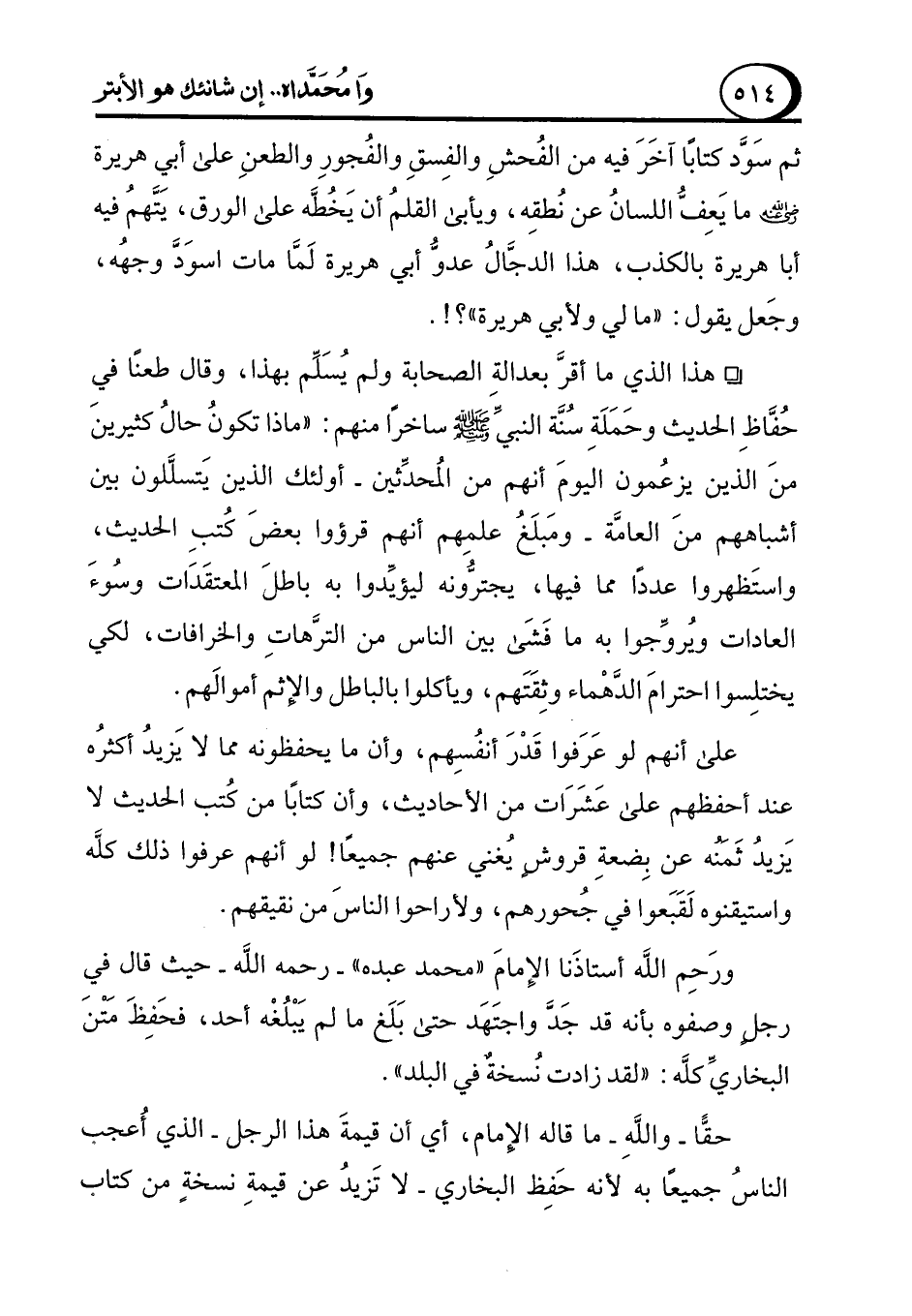 ثم سَوَّد كتابًا آخَرَ فيه من الفُحشِ والفِسقِ والفُجورِ والطعنِ على أبي هريرة - رضي الله عنه - ما يَعِفُّ اللسانُ عن نُطقِه، ويأبى القلمُ أن يَخُطَّه على الورق، يَتَّهمُ فيه أبا هريرة بالكذب، هذا الدجَّالُ عدوُّ أبي هريرة لَمَّا مات اسوَدَّ وجهُه، وجَعل يقول: "ما لي ولأبي هريرة"؟!.
