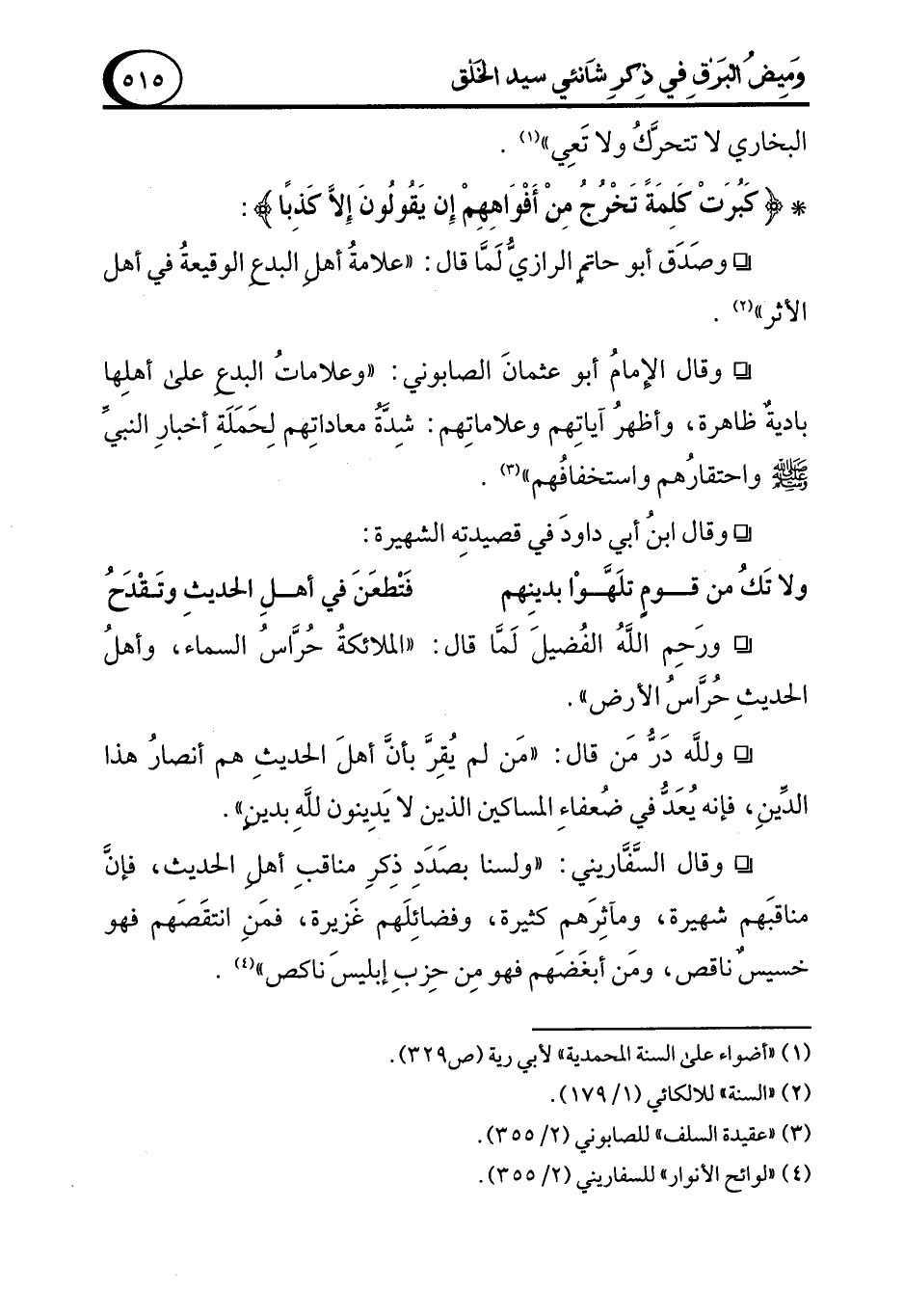° ولله دَرُّ مَن قال: "مَن لم يُقِرَّ بأنَّ أهلَ الحديثِ هم أنصارُ هذا الدِّينِ، فإنه يُعَدُّ في ضُعفاءِ المساكين الذين لا يَدِينون للهِ بدينٍ".