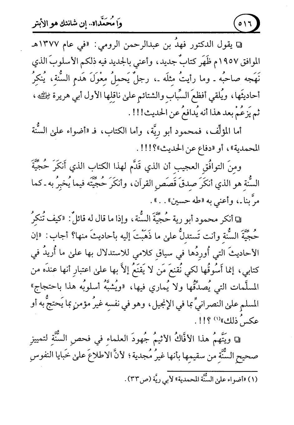 ° يقول الدكتور فهدُ بن عبد الرحمن الرومي: "في عام 1377 هـ الموافق 1957 م ظَهَر كتابٌ جديد، وأعني بالجديد فيه ذلكم الأسلوبَ الذي نَهَجه صاحبُه -وما رأيتُ مِثلَه-، رجلٌ يَحمِلُ مِعْوَلَ هَدمِ السُّنةِ، يُنكِرُ أحاديثَها، ويُلقي أفظعَ السِّبابِ والشتائمِ على ناقِلِها الأول أبي هريرة - رضي الله عنه -، ثم يَزعُمْ بعد هذا أنه يُدافعُ عن الحديث!!!.