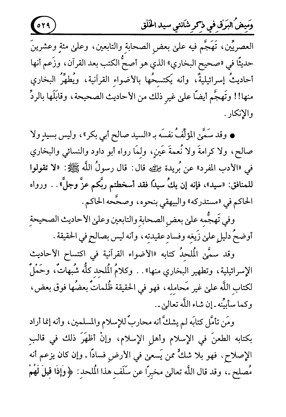• وقد سَمَّى المؤلِّف نفسَه بـ "السيد صالح أبي بكر"، وليس بسيدٍ ولا صالح، ولا كرامةَ ولا نُعمةَ عَينٍ، ولِمَا رواه أبو داود والنسائي والبخاري في "الأدب المفرد" عن بُريدة - رضي الله عنه - قال: قال رسولُ الله - صلى الله عليه وسلم -: "لا تقولوا للمنافق: "سيد"، فإنه إن يكُ سيدًا فقد أسخطتم ربَّكم عزَّ وجلَّ" .. ورواه الحاكم في "مستدركه" والبيهقي بنحوه، وصحَّحه الحاكم.