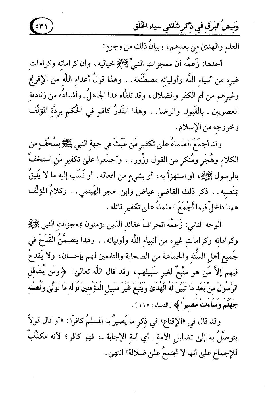 الوجه الثاني: زَعمُه انحرافَ عقائدِ الذين يؤمنون بمعجزاتِ النبي - صلى الله عليه وسلم - وكراماتِه وكراماتِ غيرِه من أنبياءِ الله وأوليائه .. وهذا يتضمَّنُ القَدْحَ في جَميع أهلِ السُّنةِ والجماعة من الصحابة والتابعين لهم بإحسان، ولا يَقدحُ فيهم إلَّا من هو متَّبعٌ لغيرِ سَبيلهم، وقد قال الله تعالى: {وَمَنْ يُشَاقِقِ الرَّسُولَ مِنْ بَعْدِ مَا تَبَيَّنَ لَهُ الْهُدَى وَيَتَّبِعْ غَيْرَ سَبِيلِ الْمُؤْمِنِينَ نُوَلِّهِ مَا تَوَلَّى وَنُصْلِهِ جَهَنَّمَ وَسَاءَتْ مَصِيرًا} [النساء: 115].