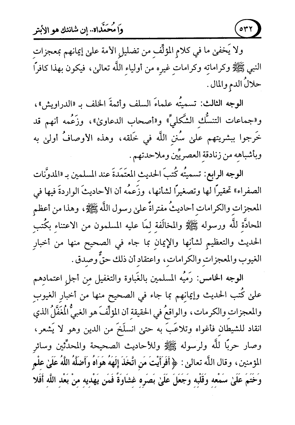 الوجه الخامس: رَميُه المسلمين بالغَباوة والتغفيل مِن أجل اعتمادِهم على كُتب الحديث وإيمانِهم بما جاء في الصحيح منها من أخبارِ الغيوبِ والمعجزاتِ والكرمات، والواقعُ في الحقيقةِ أن المؤلِّفَ هو الغبيُّ المُغَفَّلُ الذي انقاد للشيطانِ فأغواه وتلاعَبَ به حتى انسلَخَ من الدين وهو لا يَشعر، وصار حربًا لله ولرسوله - صلى الله عليه وسلم - وللأحاديث الصحيحة والمحدِّثين وسائرِ المؤمنين، وقال الله تعالى: {أَفَرَأَيْتَ مَنِ اتَّخَذَ إِلَهَهُ هَوَاهُ وَأَضَلَّهُ الله عَلَى عِلْمٍ وَخَتَمَ عَلَى سَمْعِهِ وَقَلْبِهِ وَجَعَلَ عَلَى بَصَرِهِ غِشَاوَةً فَمَنْ يَهْدِيهِ مِنْ بَعْدِ اللَّهِ أَفَلَا