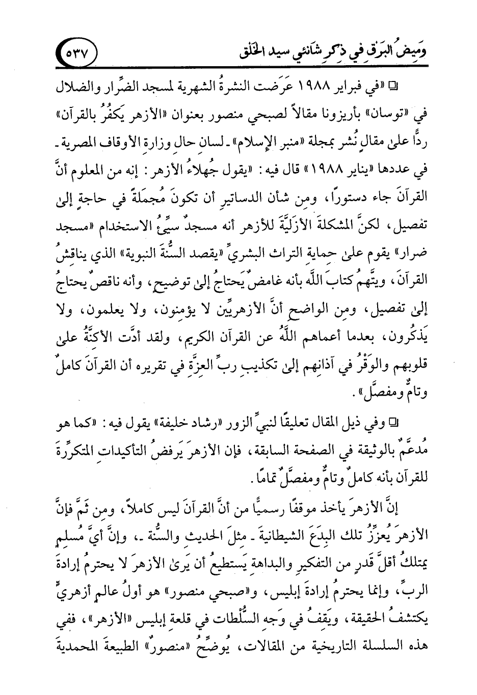 ° "في فبراير 1988 عَرَضت النشرةُ الشهرية لمسجد الضِّرار والضلال في "توسان" بأريزونا مقالاً لصبحي منصور بعنوان "الأزهر يَكفُرُ بالقرآن" ردًّا على مقالٍ نُشر بمجلة "منبر الإِسلام" -لسانِ حالِ وزارةِ الأوقاف المصرية- في عددها "يناير 1988" قال فيه: "يقول جُهلاءُ الأزهر: إنه من المعلوم أنَّ القرآنَ جاء دستورًا، ومِن شأن الدساتيرِ أن تكونَ مُجمَلةً في حاجةٍ إلى تفصيل، لكنَّ المشكلةَ الأزَليَّةَ للأزهر أنه مسجدٌ سيِّئُ الاستخدام "مسجد ضرار" يقوم على حِمايةِ التراث البشريِّ "يقصد السُّنةَ النبوية" الذي يناقِشُ القرآنَ، ويتَّهمُ كتابَ الله بأنه غامضٌ يَحتاجُ إلى توضيحٍ، وأنه ناقصٌ يحتاجُ إلى تفصيل، ومِن الواضحِ أنَّ الأزهريِّين لا يؤمِنون، ولا يعلمون، ولا يَذكُرون، بعد ما أعماهم اللهُ عن القرآن الكريم، ولقد أدَّت الأكِنَّةُ على قلوبهم والوَقْرُ في آذانِهم إلى تكذيبِ ربِّ العِزَّة في تقريره أن القرآنَ كاملٌ وتامٌ ومفصَّل".