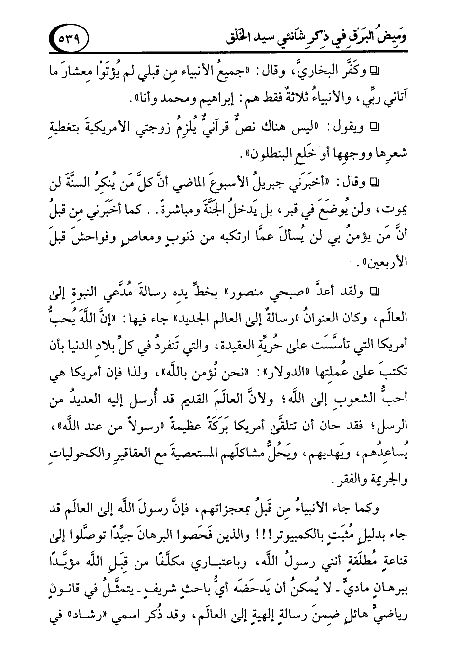 ° وكَفَّر البخاريَّ، وقال: "جميعُ الأنبياء مِن قبلي لم يُؤتَوْا مِعشارَ ما آتاني ربِّي، والأنبياءُ ثلاثة فقط هم: إبراهيم ومحمد وأنا".