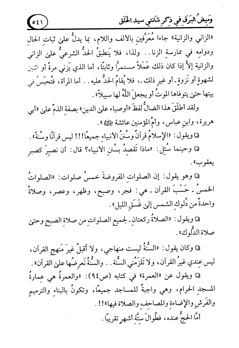 ° ويقول عن "العمرة" في كتابه (ص 94): "والعمرةُ هي عِمارةُ المسجدِ الحرام، وهي واجبةٌ للمساجد جميعًا، وتكونُ بالبناءِ والترميمِ والفرشِ والإضاءةِ والمصاحِفِ والصلاة فيها"!!.