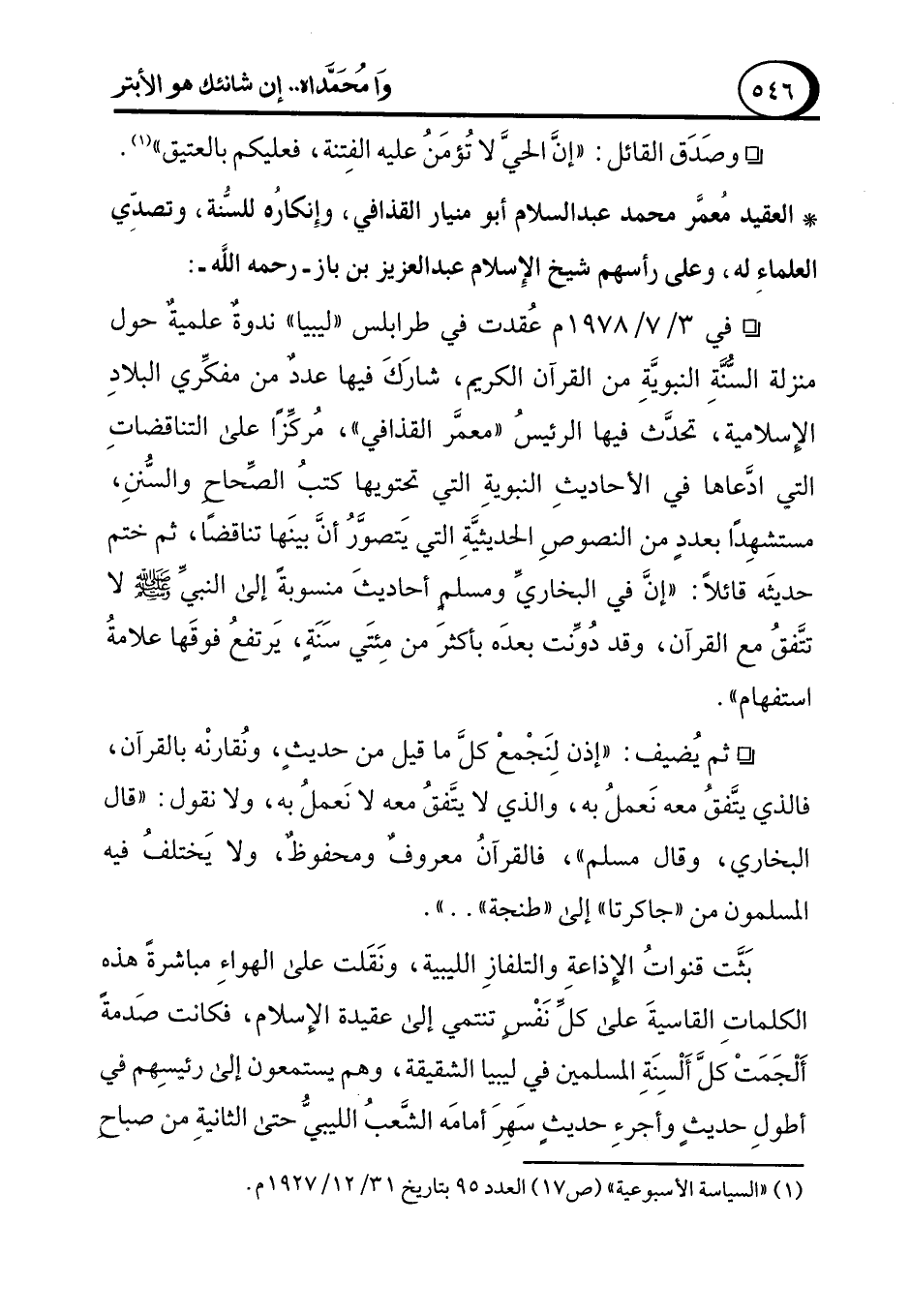 * العقيد معمَّر محمد عبد السلام أبو منيار القذافي، وإِنكارُه للسُّنة، وتصدِّي العلماءِ له، وعلى رأسهم شيخ الإِسلام عبد العزيز بن باز - رحمه الله -: