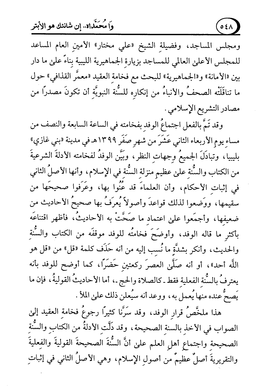 هذا ملخَّص قرارِ الوفد، وقد سَرَّنا كثيرًا رجوعُ فخامةِ العقيد إلى الصواب في الأخذِ بالسنةِ الصحيحة، وقد دَلَّتِ الأدلةُ من الكتابِ والسُّنةِ الصحيحةِ واجتماعِ أهلِ العلم على أنَّ السُّنةَ الصحيحةَ القوليةَ والفِعليةَ والتقريريةَ أصلٌ عظيمٌ من أصولِ الإِسلام، وهي الأصلُ الثاني في إثباتِ