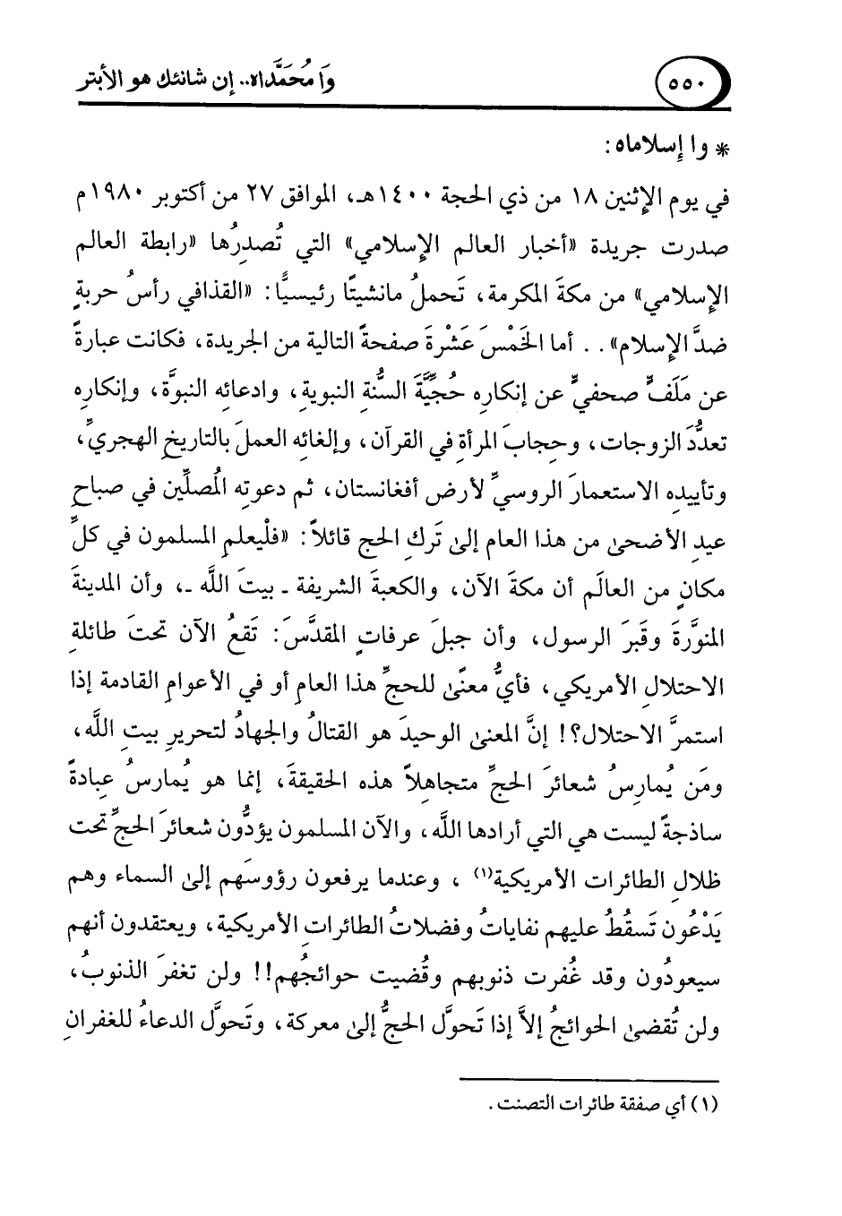 في يوم الإِثنين 18 من ذي الحجة 1400 هـ، الموافق 27 من أكتوبر 1980 م صدرت جريدة "أخبار العالم الإِسلامي" التي تُصدِرُها "رابطة العالم الإِسلامي" من مكةَ المكرمة، تَحملُ مانشيتًا رئيسيًّا: "القذافي رأسُ حربةٍ ضدَّ الإِسلام" .. أما الخَمْسَ عَشْرةَ صفحةً التالية من الجريدة، فكانت عبارةً عن مَلَفٍّ صحفيٍّ عن إنكارِه حُجِّيَّةَ السُّنةِ النبويةِ، وادعائِه النبوَّة، وإنكارِه تعدُّدَ الزوجات، وحِجابَ المرأةِ في القرآن، وإلغائِه العملَ بالتاريخِ الهجريِّ، وتأييدِه الاستعمارَ الروسي لأرض أفغانستان، ثم دعوتِه المُصلِّين في صباحِ عيدِ الأضحى من هذا العام إلى تَركِ الحج قائلاً: "فلْيعلمِ المسلمون في كلِّ مكانٍ من العالَم أن مكةَ الآن، والكعبةَ الشريفة -بيتَ الله-، وأن المدينةَ المنوَّرةَ وقَبرَ الرسول، وأن جبلَ عرفاتٍ المقدَّسَ: تَقعُ الآن تحتَ طائلةِ الاحتلالِ الأمريكي، فأيُّ معنًى للحجِّ هذا العامِ أو في الأعوامِ القادمة إذا استمرَّ الاحتلال؟! إنَّ المعنى الوحيدَ هو القتالُ والجهادُ لتحريرِ بيتِ الله، ومَن يُمارِسُ شعائرَ الحجِّ متجاهِلاً هذه الحقيقةَ، إنما هو يُمارسُ عِبادةً ساذجةً ليست هي التي أرادها الله، والآن المسلمون يؤدُّون شعائرَ الحجِّ تحت ظلالِ الطائرات الأمريكية (¬1)، وعندما يرفعون رؤوسَهم إلى السماء وهم يَدْعُون تَسقُطُ عليهم نفاياتُ وفضلاتُ الطائراتِ الأمريكية، ويعتقدون أنهم سيعودُون وقد غُفرت ذنوبهم وقُضيت حوائجُهم!! ولن تغفرَ الذنوبُ، ولن تُقضى الحوائجُ إلَّا إذا تَحوَّل الحجُّ إلى معركة، وتَحوَّل الدعاءُ للغفرانِ