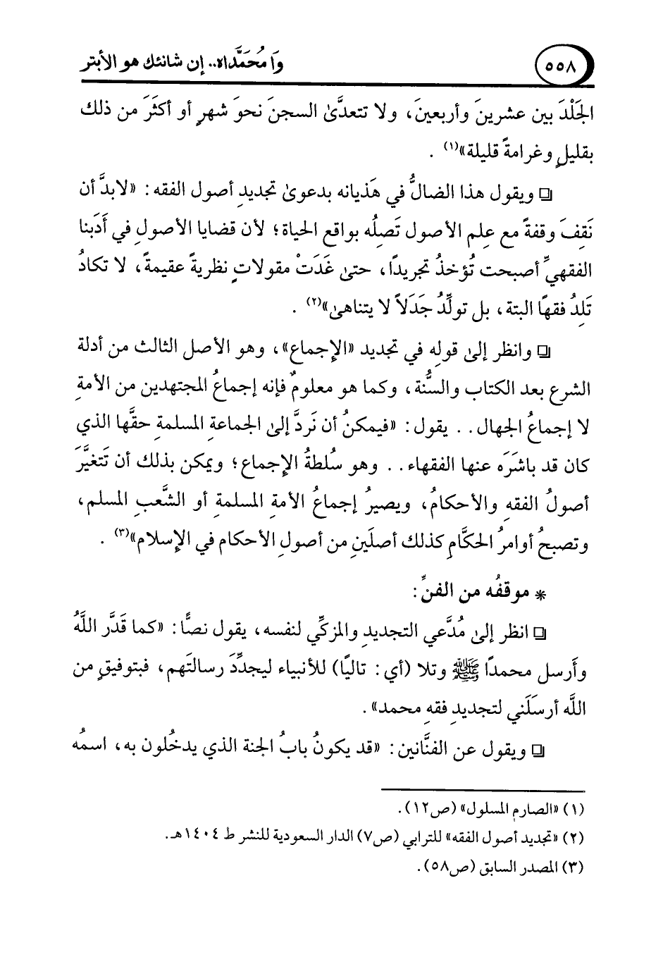 ° وانظر إلى قولِه في تجديد "الإِجماع"، وهو الأصل الثالث من أدلة الشرع بعد الكتاب والسُّنة، وكما هو معلومٌ فإنه إجماعُ المجتهدين من الأمةِ لا إجماعُ الجهال .. يقول: "فيمكنُ أن نَردَّ إلى الجماعةِ المسلمةِ حقَّها الذي كان قد باشَرَه عنها الفقهاء .. وهو سُلطةُ الإِجماع؛ ويمكن بذلك أن تَتغيَّرَ أصولُ الفقهِ والأحكامُ، ويصيرُ إجماعُ الأمةِ المسلمةِ أو الشَّعبِ المسلم، وتصبحُ أوامرُ الحكَّامِ كذلك أصلَينِ من أصولِ الأحكام في الإِسلام" (¬3).