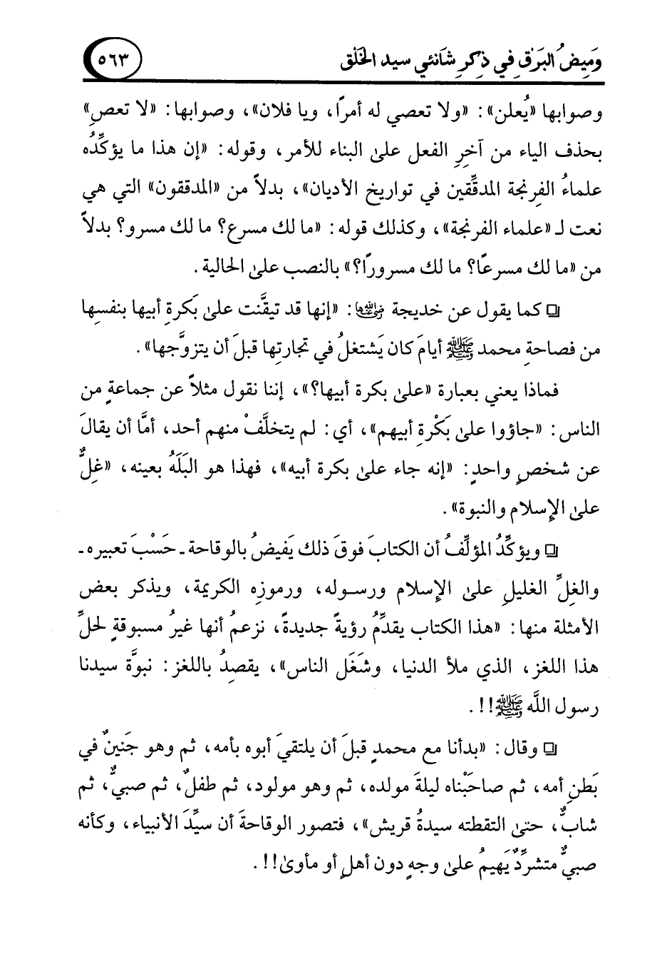 ° كما يقول عن خديجة - رضي الله عنها -: "إنها قد تيقَّنت على بَكرةِ أبيها بنفسِها من فصاحةِ محمد - صلى الله عليه وسلم - أيامَ كان يَشتغلُ في تجارتِها قبلَ أن يتزوَّجها".