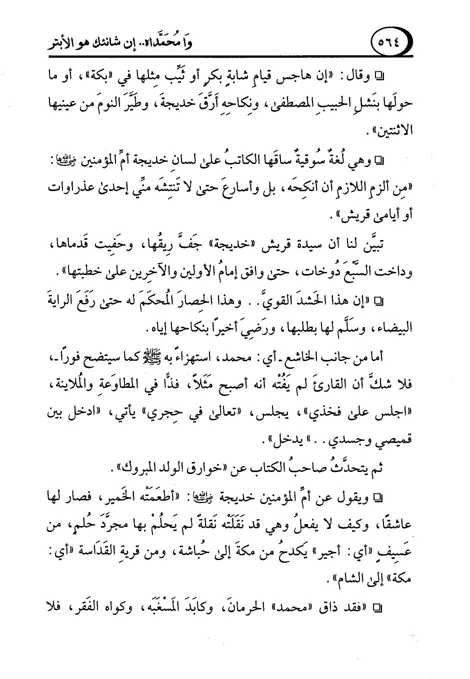 ° وقال: "إن هاجس قيامِ شابةٍ بكرٍ أو ثَيِّب مِثلها في "بكة"، أو ما حولَها بنَشلِ الحبيبِ المصطفى، ونِكاحِهِ أَرَّقَ خديجةَ، وطَيَّرَ النومَ من عينيها الاثنتين".