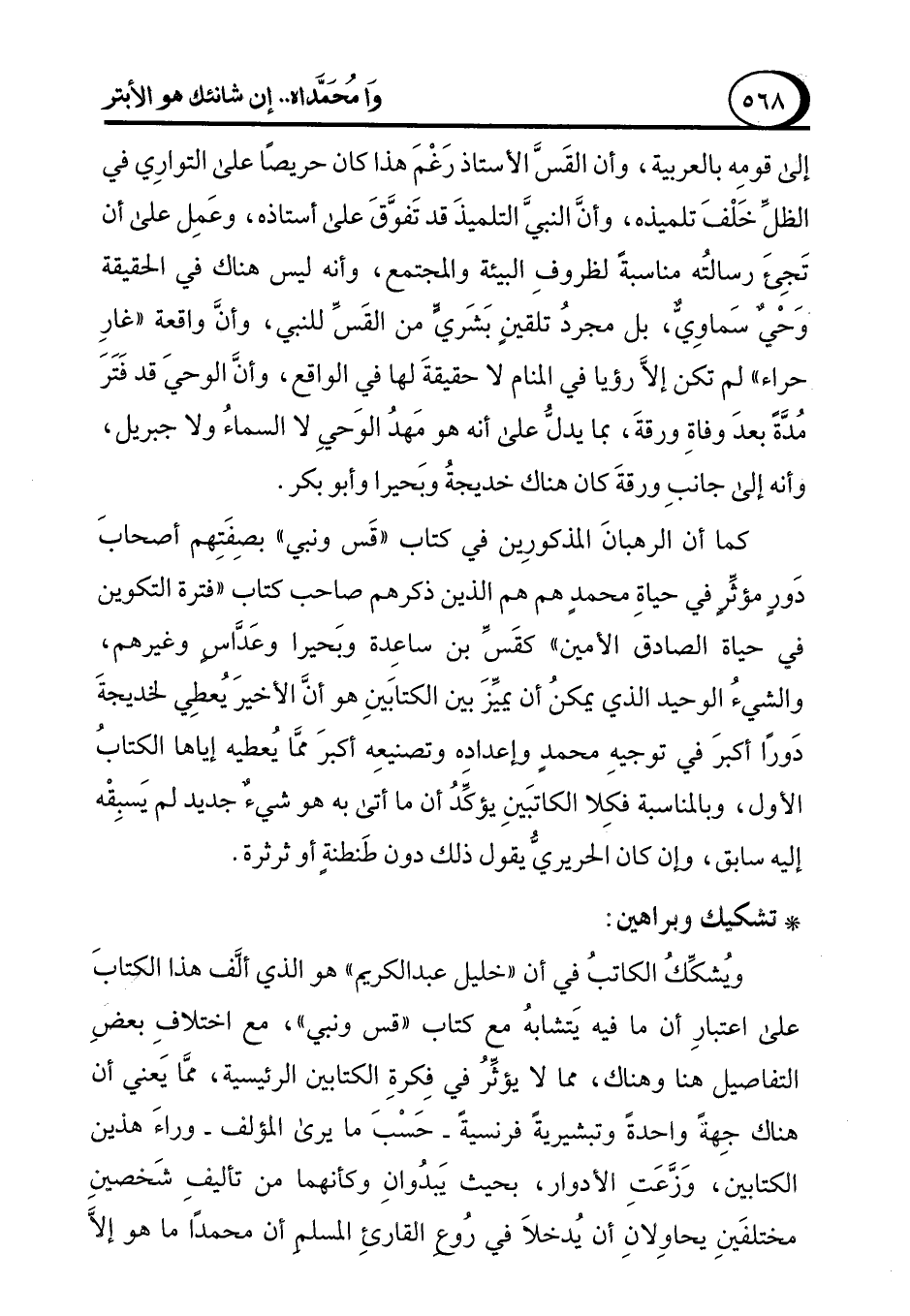 ويُشكِّكُ الكاتبُ في أن "خليل عبد الكريم" هو الذي ألَّف هذا الكتابَ على اعتبارِ أن ما فيه يَتشابهُ مع كتاب "قس ونبي"، مع اختلافِ بعضِ التفاصيل هنا وهناك، مما لا يؤثِّرُ في فِكرةِ الكتابين الرئيسية، ممَّا يَعني أن هناك جِهةً واحدةً وتبشيريةً فرنسيةً -حَسْبَ ما يرى المؤلف- وراءَ هذن الكتابين، وَزَّعَتِ الأدوار، بحيث يَبدُوانِ وكأنهما من تأليف شَخصين مختلفينِ يحاوِلانِ أن يُدخلاَ في رُوعِ القارئِ المسلمِ أن محمدًا ما هو إلَّا