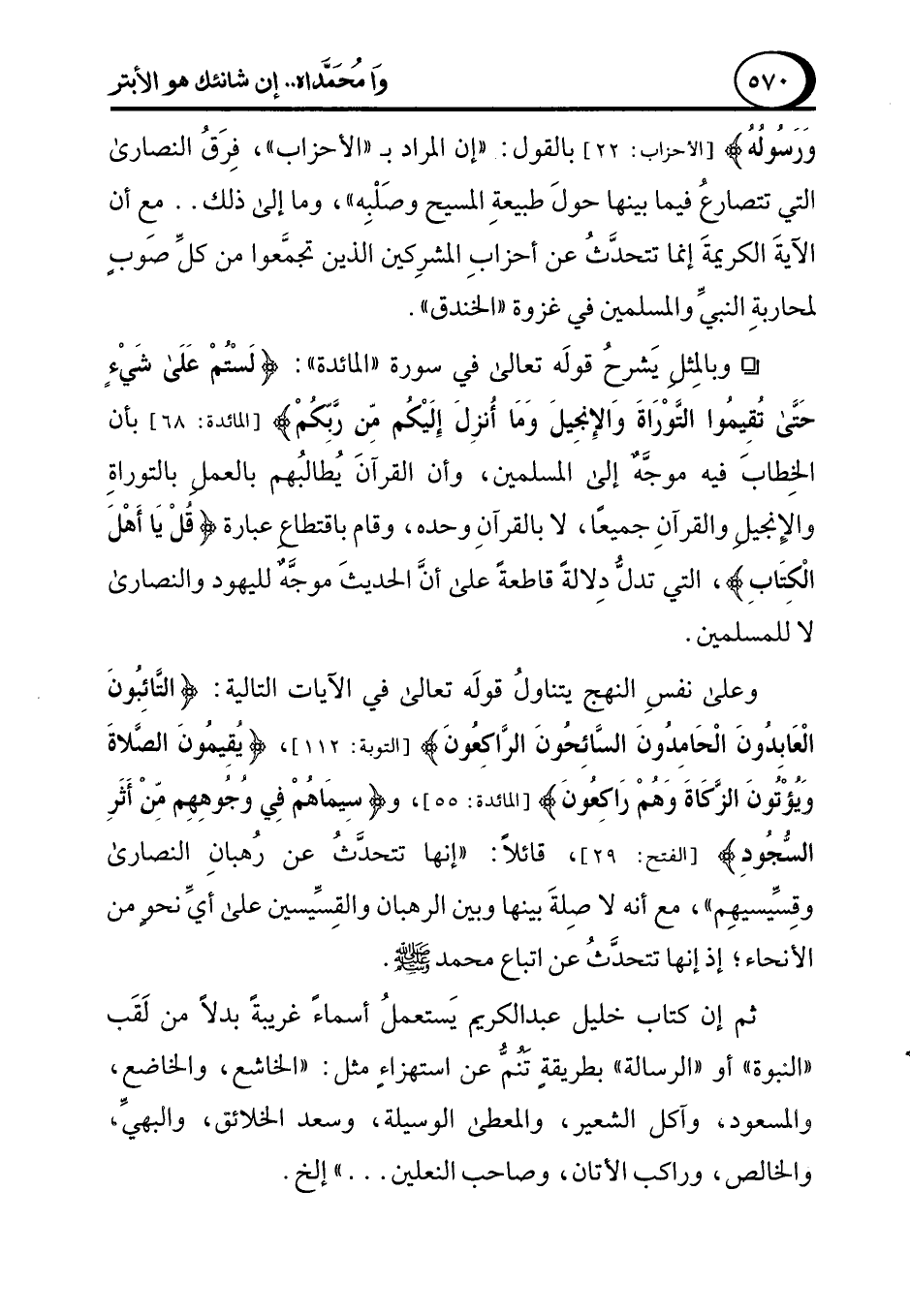وعلى نفسِ النهج يتناولُ قولَه تعالى في الآيات التالية: {التَّائِبُونَ الْعَابِدُونَ الْحَامِدُونَ السَّائِحُونَ الرَّاكِعُونَ} [التوبة: 112]، {يُقِيمُونَ الصَّلَاةَ وَيُؤْتُونَ الزَّكَاةَ وَهُمْ رَاكِعُونَ} [المائدة: 55]، و {سِيمَاهُمْ فِي وُجُوهِهِمْ مِنْ أَثَرِ السُّجُودِ} [الفتح: 29]، قائلاً: "إنها تتحدَّثُ عن رُهبانِ النصارى وقِسِّيسيهِم"، مع أنه لا صِلةَ بينها وبين الرهبان والقِسِّيسين على أيِّ نحوٍ من الأنحاء؛ إذ إنها تتحدَّثُ عن اتباع محمد - صلى الله عليه وسلم -.