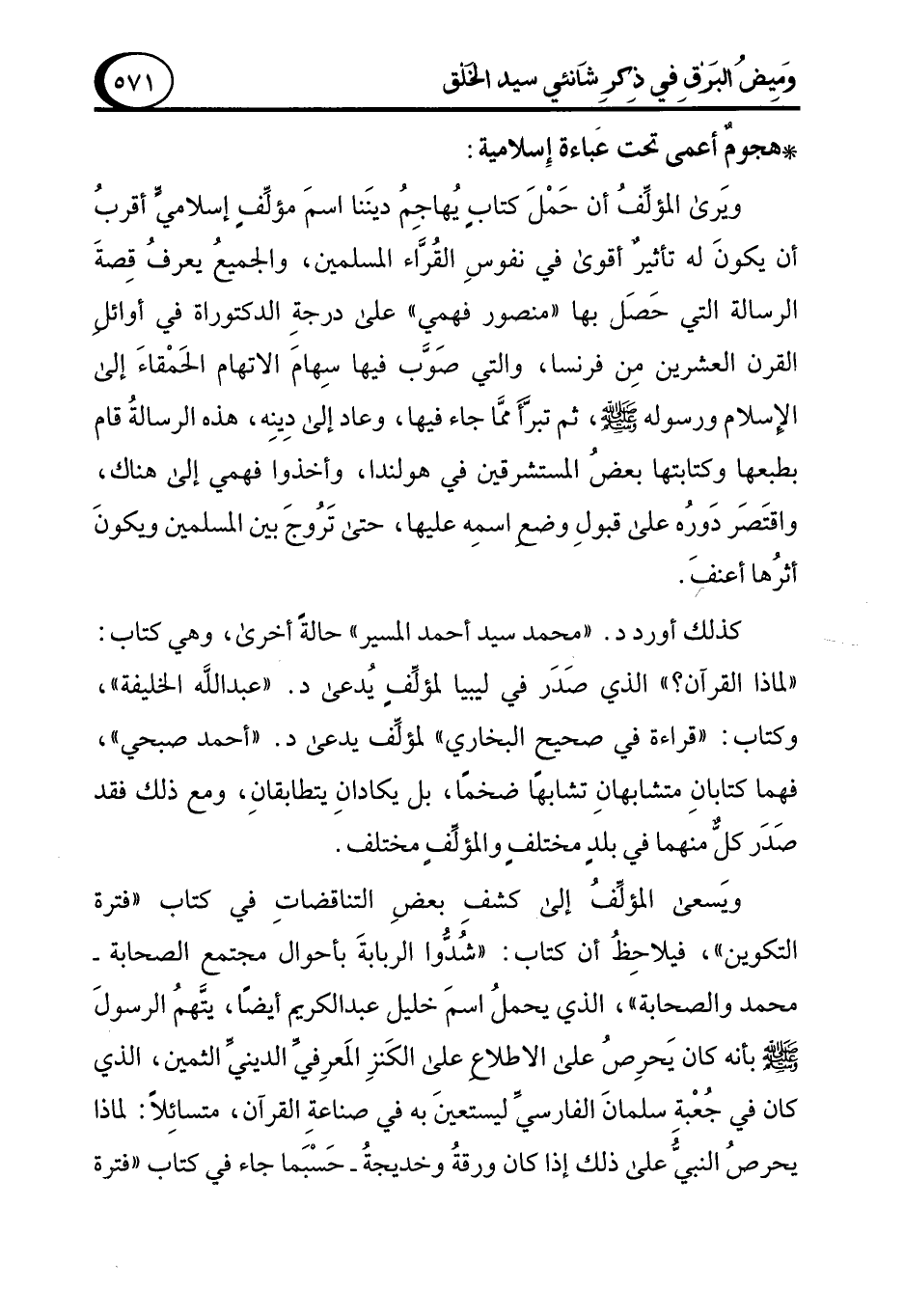 ويَرى المؤلِّفُ أن حَمْلَ كتابٍ يُهاجِمُ دينَنا اسمَ مؤلِّفٍ إسلاميٍّ أقربُ أن يكونَ له تأثيرٌ أقوى في نفوسِ القُرَّاء المسلمين، والجميعُ يعرفُ قِصةَ الرسالة التي حَصَل بها "منصور فهمي" على درجةِ الدكتوراة في أوائلِ القرن العشرين مِن فرنسا، والتي صَوَّب فيها سِهامَ الاتهام الحَمْقاءَ إلى الإِسلام ورسوله - صلى الله عليه وسلم -، ثم تبرَّأ ممَّا جاء فيها، وعاد إلى دِينِه، هذه الرسالةُ قام بطبعها وكتابتها بعضُ المستشرقين في هولندا، وأخذوا فهمي إلى هناك، واقتَصَر دَورُه على قبولِ وضعِ اسمِه عليها، حتى تَرُوجَ بين المسلمين ويكونَ أثرُها أعنفَ.