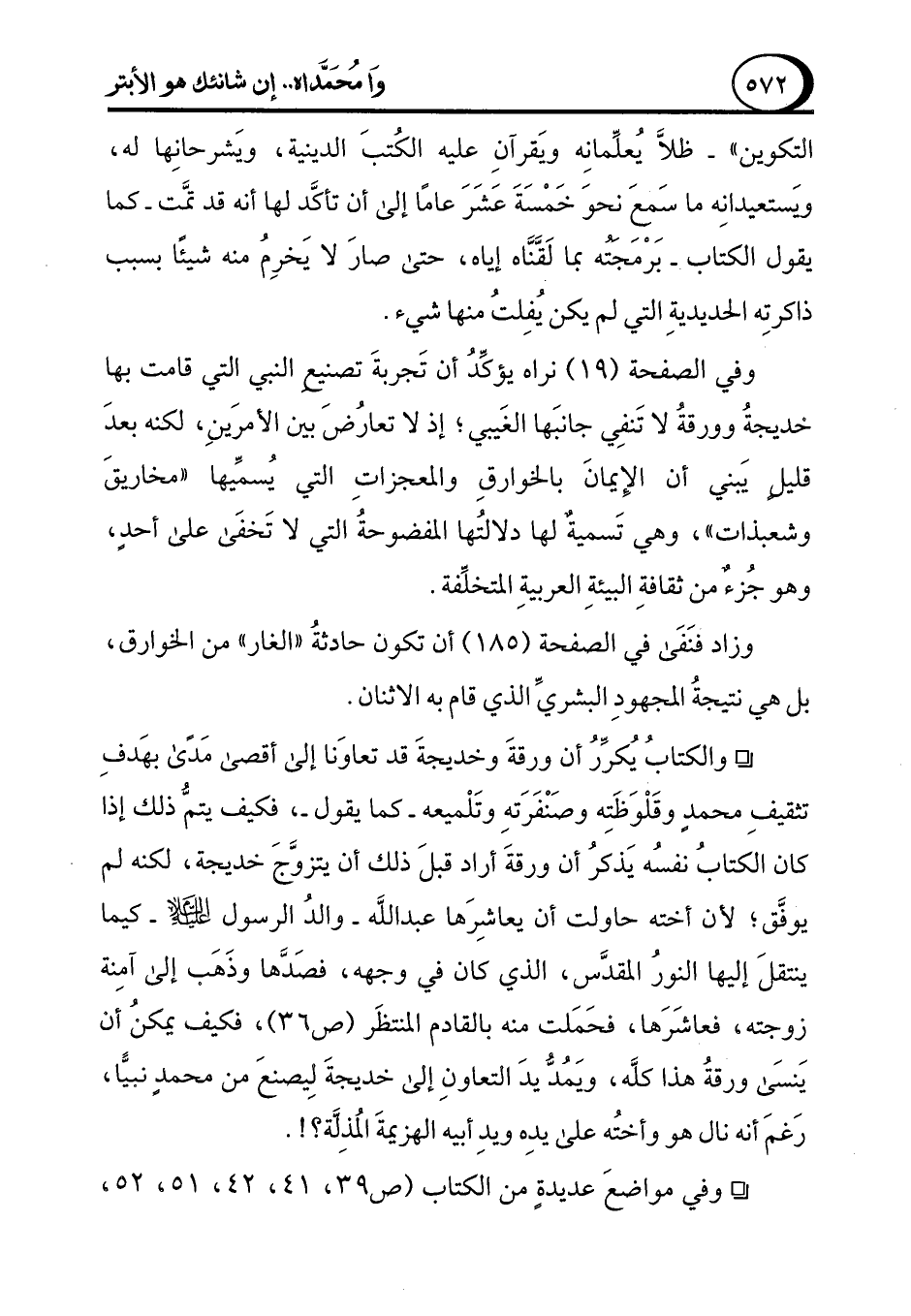 ° والكتابُ يُكرِّرُ أن ورقةَ وخديجةَ قد تعاوَنا إلى أقصى مَدًى بهَدفِ تثقيفِ محمدٍ وقَلْوَظَتِه وصَنْفَرَتهِ وتَلْميعه -كما يقول-، فكيف يتمُّ ذلك إذا كان الكتابُ نفسُه يَذكرُ أن ورقةَ أراد قبلَ ذلك أن يتزوَّجَ خديجة، لكنه لم يوفَّق؛ لأن أخته حاولت أن يعاشِرَها عبد الله -والدُ الرسول عليه السلام- كيما ينتقلَ إليها النورُ المقدَّس، الذي كان في وجهه، فصَدَّها وذَهَب إلى آمِنة زوجته، فعاشَرَها، فحَمَلت منه بالقادم المنتظَر (ص 36)، فكيف يمكنُ أن يَنسَى ورقةُ هذا كلَّه، ويَمُدُّ يدَ التعاونِ إلى خديجةَ ليصنعَ من محمدٍ نبيًّا، رَغمَ أنه نال هو وأختُه على يدِه ويدِ أبيه الهزيمةَ المُذِلَّة؟!.