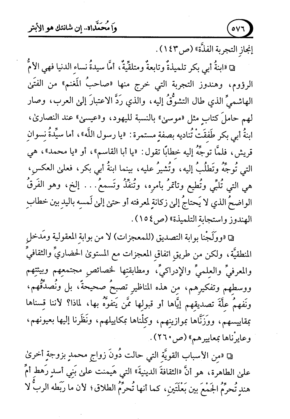 ° "ابنةُ أبي بكر تلميذةٌ وتابعةٌ ومتلقِّيةٌ، أمَّا سيدةُ نساءِ الدنيا فهي الأمُّ الرؤوم، وهندوز التجربة التي خرج منها "صاحبُ المَغنم" من الفتَى الهاشميِّ الذي طال التشوُّقُ إليه، والذي رَدَّ الاعتبارَ إلى العرب، وصار لهم حاملَ كتابٍ مثل "موسى" بالنسبة لليهود، و"عيسى" عند النصارى، ابنةُ أبي بكر طَفِقَتْ تُناديه بصفةٍ مستمرة: "يا رسول الله"، أما سيِّدةُ نِسوانِ قريش، فلمَّا توجِّهُ إليه خِطابًا تقول: "يا أبا القاسم"، أو "يا محمد"، هي التي تُوجِّهُ وتَطلُبُ إليه، وتُشيرُ عليه، بينما ابنةُ أبي بكر، فعلى العكسِ، هي التي تُلبِّي وتُطيع وتأتمرُ بأمرِه، وتُنفِّذُ وتَسمعُ ... إلخ، وهو الفَرقُ الواضحُ الذي لا يَحتاجُ إلى زكانةٍ لمعرفته أو حتى إلى لَمسِه باليدِ بين خطابِ الهندوز واستجابةِ التلميذة" (ص 154).
