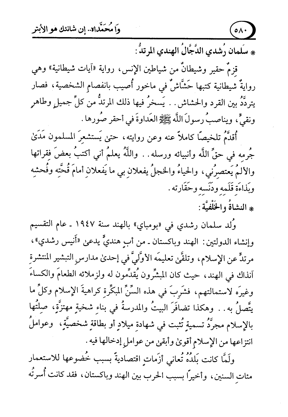 قِزمٌ حقير وشيطانٌ من شياطين الإِنس، رواية "آيات شيطانية" وهي روايةٌ شيطانية كتبها حَشَّاشٌ في ماخور أُصيب بانفصامِ الشخصية، فصار يتردَّدُ بين القرد والحشاش .. يَسخرُ فيها ذلك المرتدُّ من كلِّ جميلٍ وطاهرٍ ونقيٍّ، ويناصبُ رسولَ الله - صلى الله عليه وسلم - العَداوةَ في أحقر صُورها.