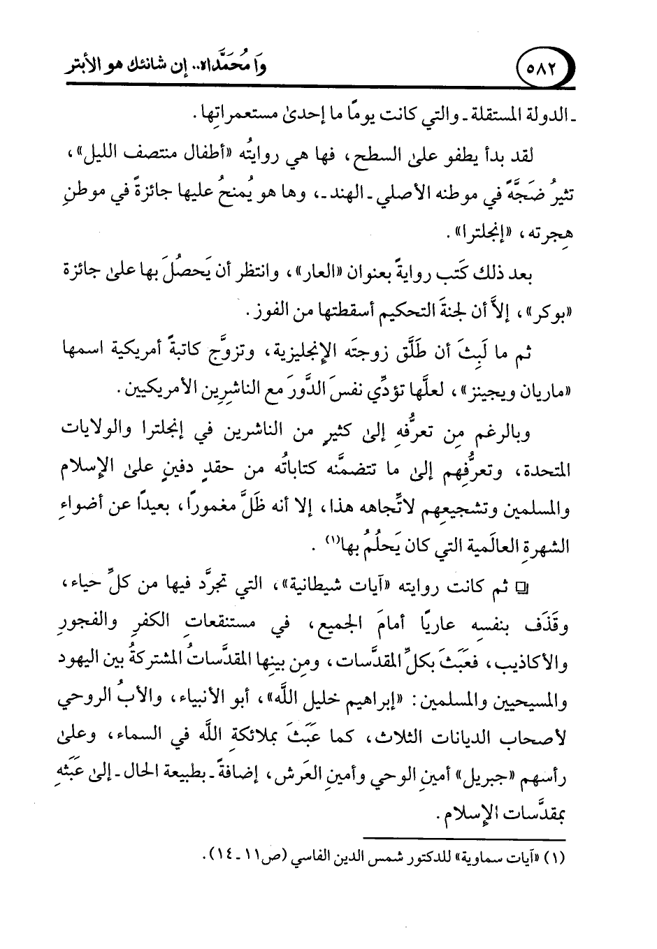 ° ثم كانت روايته "آيات شيطانية"، التي تجرَّد فيها من كلِّ حياء، وقَذَف بنفسِه عاريًا أمامَ الجميع، في مستنقعات الكفرِ والفجورِ والأكاذيب، فعَبَثَ بكلِّ المقدَّسات، ومِن بينِها المقدَّسات المشتركةُ بين اليهود والمسيحيين والمسلمين: "إبراهيم خليل الله"، أبو الأنبياء، والأبُ الروحي لأصحاب الديانات الثلاث، كما عَبَثَ بملائكةِ الله في السماء، وعلى رأسهم "جبريل" أمينِ الوحي وأمينِ العَرش، إضافةً -بطبيعة الحال- إلى عَبَثهِ بمقدَّسات الإِسلام.