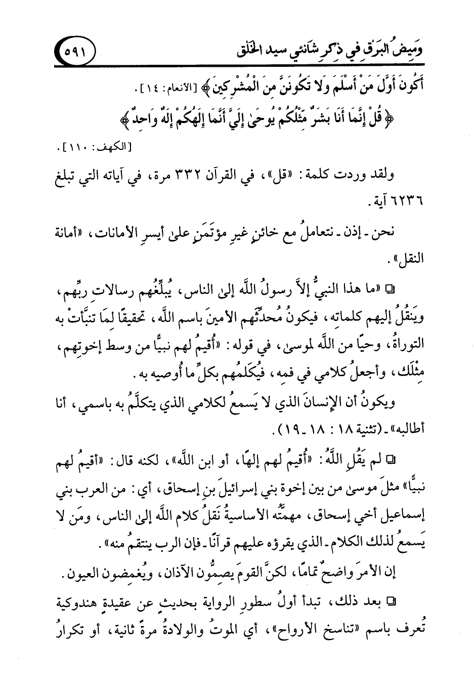 ° "ما هذا النبيُّ إلَّا رسولُ الله إلى الناس، يُبلِّغُهم رسالاتِ ربِّهم، ويَنقُلُ إليهم كلماتِه، فيكون مُحدِّثَهم الأمينَ باسم الله، تحقيقًا لِمَا تنبَّأتْ به التوراةُ، وحيًا من الله لموسى، في قوله: "أُقيمُ لهم نبيًّا من وسط إخوتِهم، مِثْلَك، وأجعلُ كلامي في فمِه، فيُكَلمُهم بكلِّ ما أُوصيه به.