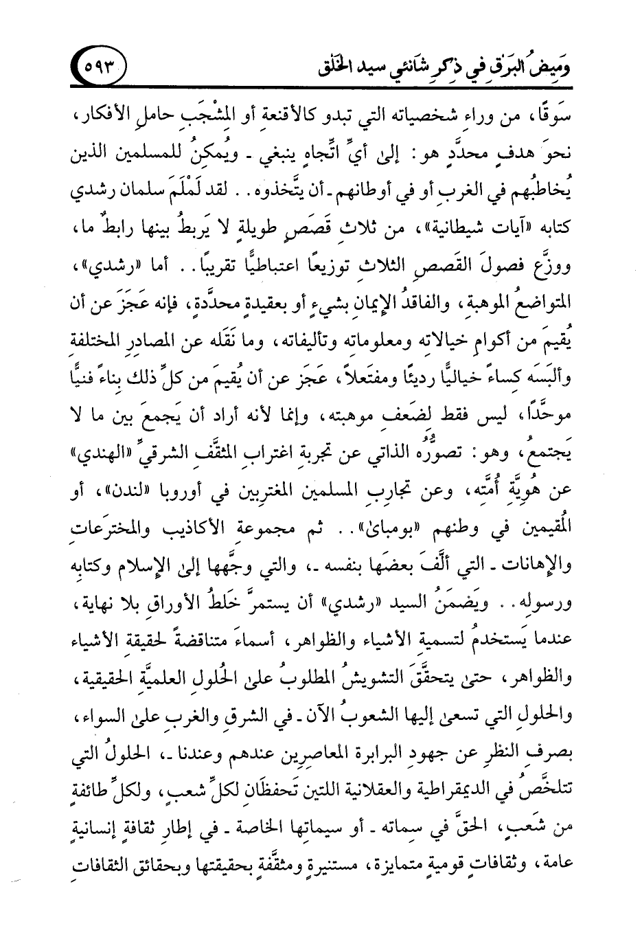 سَوقًا، من وراءِ شخصياته التي تبدو كالأقنعةِ أو المشْجَبِ حاملِ الأفكار، نحوَ هدفٍ محدَّدٍ هو: إلى أيِّ اتِّجاهٍ ينبغي -ويُمكِنُ للمسلمين الذين يُخاطبُهم في الغربِ أو في أوطانهم- أن يتَّخذوه .. لقد لَمْلَمَ سلمان رشدي كتابه "آيات شيطانية"، من ثلاثِ قَصَصٍ طويلةٍ لا يَربطُ بينها رابطٌ ما، ووزَّع فصولَ القَصصِ الثلاثِ توزيعًا اعتباطيًّا تقريبًا .. أما "رشدي"، المتواضعُ الموهبةِ، والفاقدُ الإِيمانِ بشيءٍ أو بعقيدةٍ محدَّدةٍ، فإنه عَجَزَ عن أن يُقيمَ من أكوام خيالاتِه ومعلوماتِه وتأليفاته، وما نَقَله عن المصادِرِ المختلفةِ وألبَسَه كِساءً خياليًّا رديئًا ومفتَعلاً، عَجَز عن أن يقيمَ من كلِّ ذلك بِناءً فنيًّا موحَّدًا، ليس فقط لضَعفِ موهبته، وإنما لأنه أراد أن يَجمعَ بين ما لا يَجتمعُ، وهو: تصوُّرُه الذاتي عن تجربةِ اغترابِ المثقَّفِ الشرقيِّ "الهندي" عن هُوِيَّةِ أُمَّتِه، وعن تجارِبِ المسلمين المغترِبين في أوروبا "لندن"، أو المُقيمين في وطنهم "بومباي" .. ثم مجموعةِ الأكاذيب والمخترَعاتِ والإهانات -التي ألَّفَ بعضها بنفسه-، والتي وجَّهها إلى الإِسلام وكتابِه ورسوله .. ويَضمَنُ السيد "رشدي" أن يستمرَّ خَلط الأوراقِ بلا نهاية، عندما يَستخدمُ لتسميةِ الأشياء والظواهر، أسماءَ متناقضةً لحقيقةِ الأشياء والظواهر، حتى يتحقَّقَ التشويشُ المطلوبُ على الحُلولِ العلميَّةِ الحقيقية، والحلول التي تسعى إليها الشعوبُ الآن -في الشرقِ والغربِ على السواء، بصرفِ النظرِ عن جهودِ البرابرة المعاصِرِين عندهم وعندنا-، الحلولُ التي تتلخَّصُ في الديمقراطية والعقلانية اللتين تَحفظَانِ لكلِّ شعبٍ، ولكل طائفةٍ من شَعبٍ، الحقَّ في سِماته -أو سيماتِها الخاصة- في إطارِ ثقافةٍ إنسانيةٍ عامة، وثقافاتٍ قوميةٍ متمايزة، مستنيرةٍ ومثقَّفةٍ بحقيقتها وبحقائق الثقافاتِ