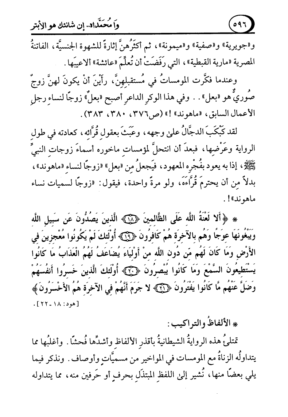 لقد كَبْكَبَ الدجَّالُ على وجهه، وعَبَثَ بعقولِ قُرَّائِه، كعادته في طولِ الرواية وعَرْضِها، فبعدَ أن انتحلَّ لمؤمساتِ ماخوره أسماءَ زوجاتِ النبيِّ - صلى الله عليه وسلم -، إذا به يعود بفُجْرِه المعهود، فيَجعلُ مِن "بعل" "زوجًا لنساءِ "ماهوند"، بدلاً مِن أن يحترمَ قُرَّاءَهَ، ولو مرةً واحدة، فيقول: "زوجًا لسميات نساء ماهوند"!.