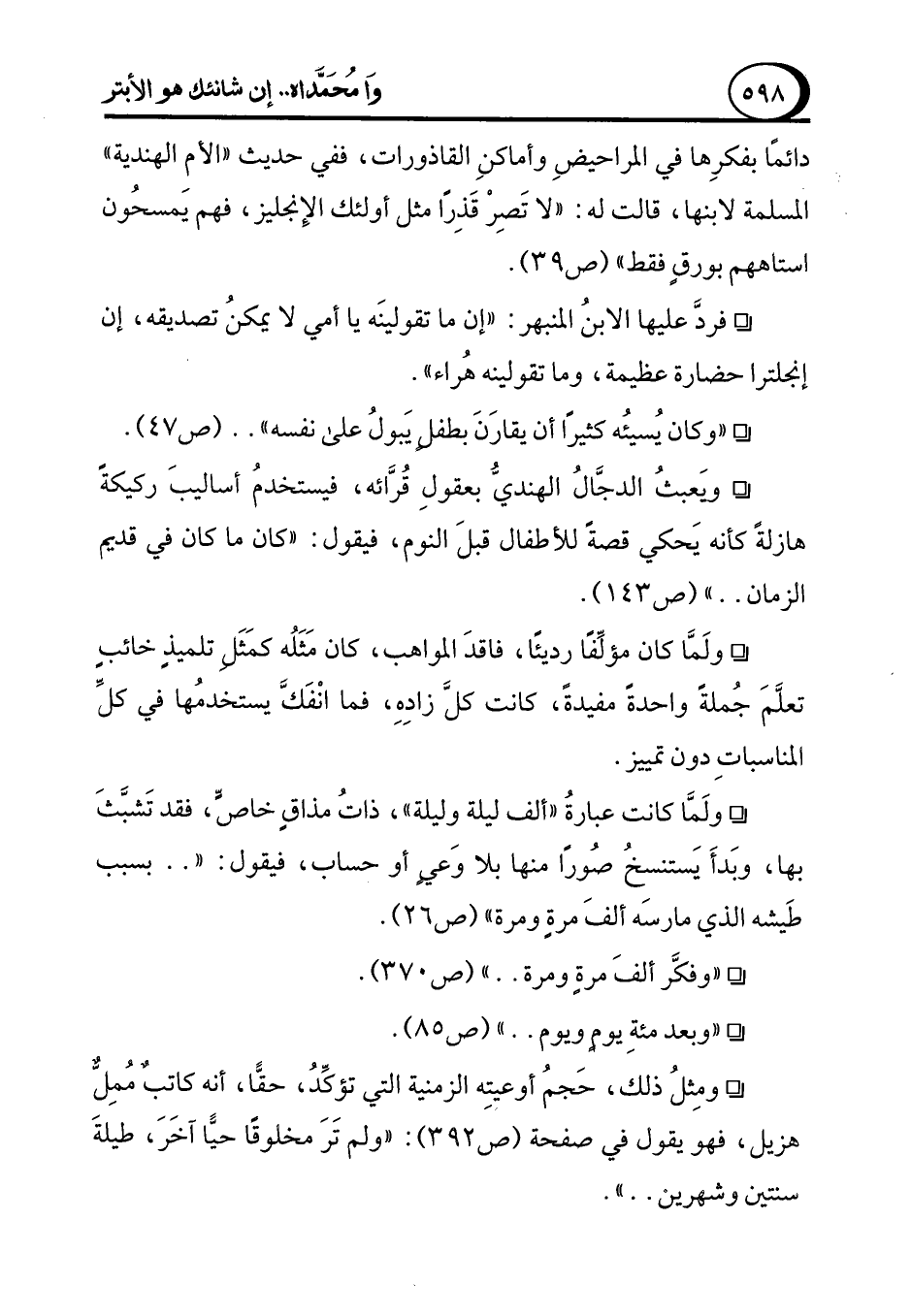 ° وَيعبثُ الدجَّالُ الهنديُّ بعقولِ قُرَّائه، فيستخدمُ أساليبَ ركيكةً هازلةً كأنه يَحكي قصةً للأطفال قبلَ النوم، فيقول: "كان ما كان في قديم الزمان .. " (ص 143).