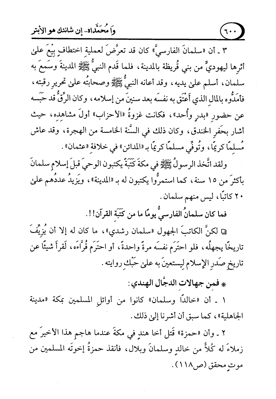 ° لكنَّ الكاتبَ الجهول "سلمان رشدي"، ما كان له إلا أن يُزِيِّفَ تاريخًا يجهلُه، فلو احتَرَم نفسَه مرةً واحدةً، أو احتَرَم قُرَّاءَه، لَقرأَ شيئًا عن تاريخِ صَدرِ الإِسلام لِيستعينَ به على حَبْكِ روايته.