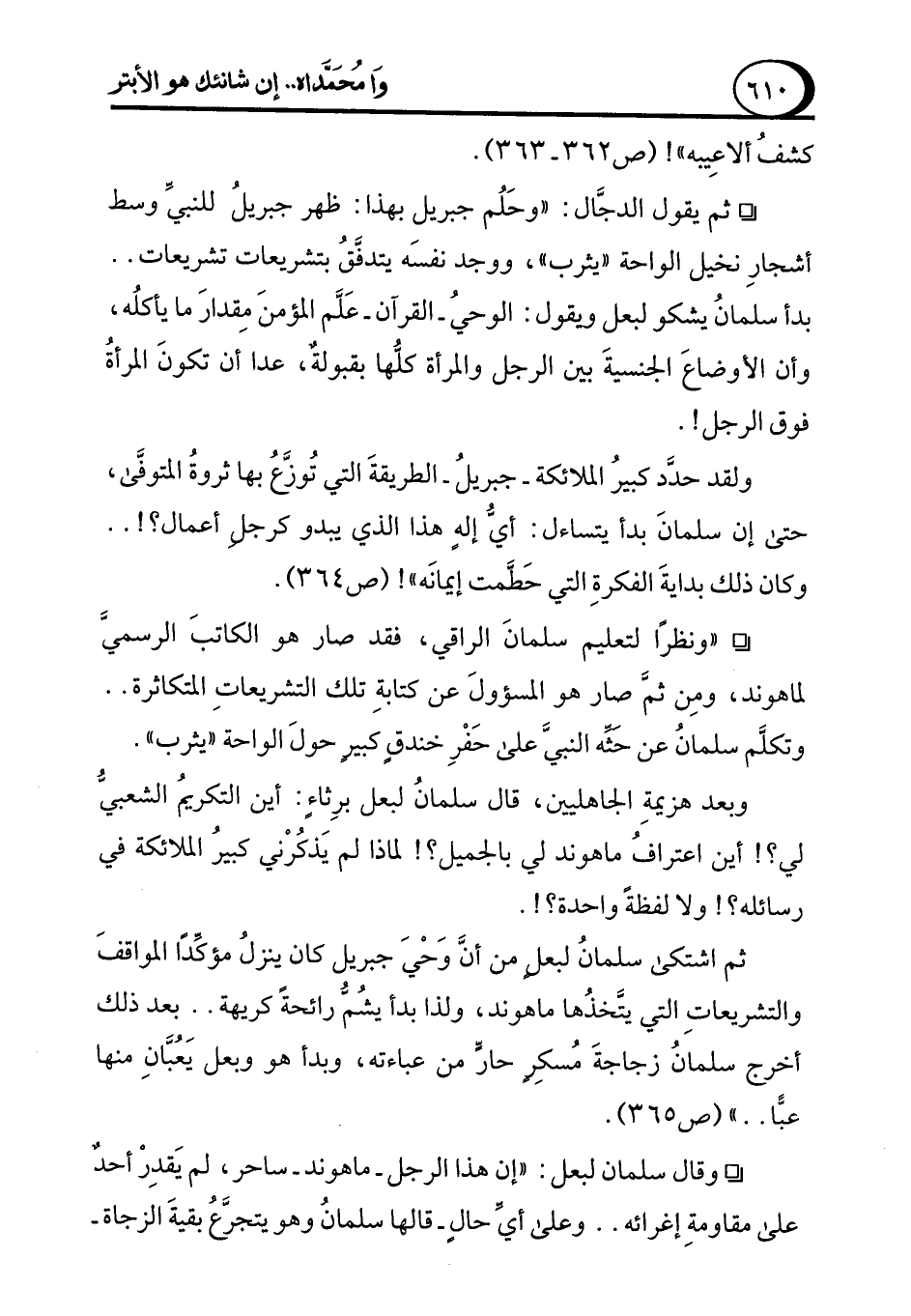 ° ثم يقول الدجَّال: "وحَلُم جبريل بهذا: ظهر جبريلُ للنبيِّ وسط أشجارِ نخيل الواحة "يثرب"، ووجد نفسَه يتدفَقُ بتشريعات تشريعات .. بدأ سلمانُ يشكو لبعل ويقول: الوحيُ -القرآن- عَلَّم المؤمنَ مِقدارَ ما يأكلُه، وأن الأوضاعَ الجنسيةَ بين الرجل والمرأة كلُّها مقبولةٌ، عدا أن تكونَ المرأةُ فوق الرجل!.