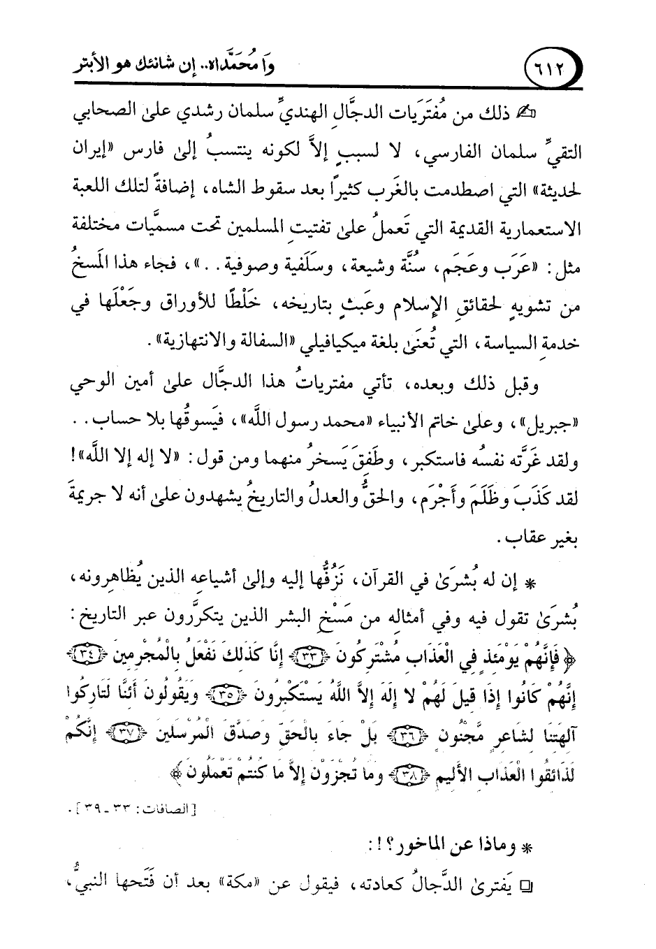 وقبل ذلك وبعده، تأتي مفترياتُ هذا الدجَّال على أمين الوحي "جبريل"، وعلى خاتم الأنبياء "محمد رسول الله"، فيَسوقُها بلا حساب .. ولقد غَرَّته نفسُه فاستكبر، وطَفِقَ يَسخرُ منهما ومن قول: "لا إله إلا الله"! لقد كَذَبَ وظَلَمَ وأَجْرَم، والحقُّ والعدلُ والتاريخُ يشهدون على أنه لا جريمةَ بغير عقاب.