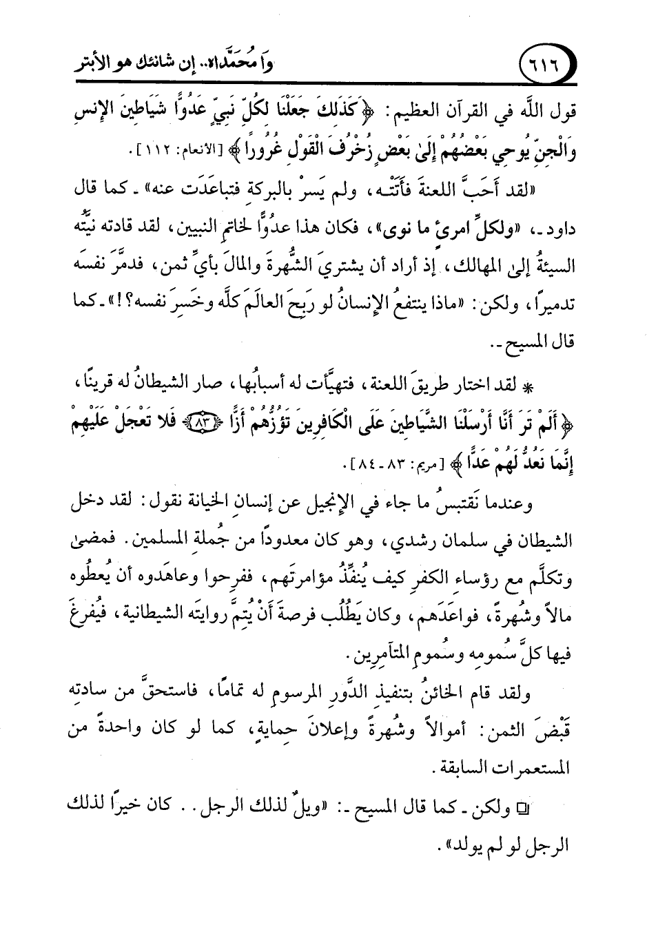 "لقد أَحَبَّ اللعنةَ فأَتَتْه، ولم يَسرْ بالبركةِ فتباعَدَت عنه" -كما قال داود-، "ولكلِّ امرئٍ ما نوى"، فكان هذا عدُوًّا لخاتمِ النبيين، لقد قادته نيَّتُه السيئةُ إلى المهالك، إذ أراد أن يشتريَ الشُّهرةَ والمالَ بأيِّ ثمن، فدمَّرَ نفسَه تدميرًا، ولكن: "ماذا ينتفعُ الإنسانُ لو رَبِحَ العالَمَ كلَّه وخَسِرَ نفسه؟! " -كما قال المسيح-.