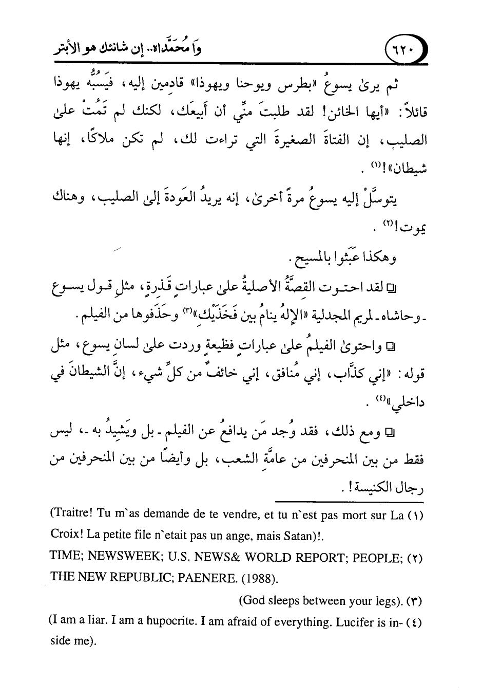 ° واحتوى الفيلمُ على عباراتٍ فظيعةٍ وردت على لسانِ يسوع، مثل قوله: "إني كذَّاب، إني مُنافق، إني خائفٌ من كلِّ شيء، إنَّ الشيطانَ في داخلي" (¬4).