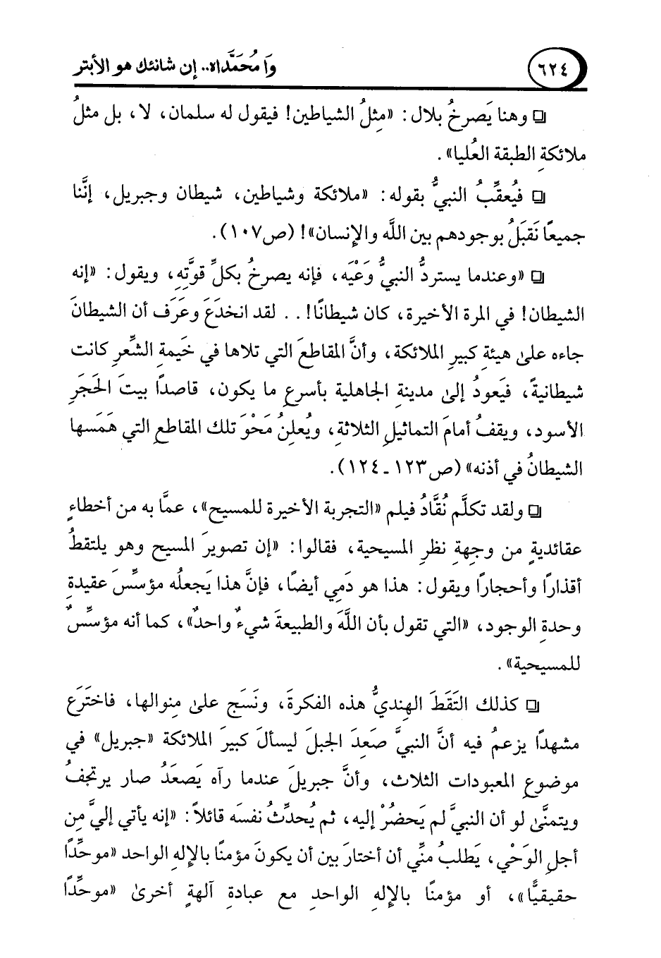 ° فيُعقِّبُ النبيُّ بقوله: "ملائكة وشياطين، شيطان وجبريل، إنَّنا جميعًا نَقبَلُ بوجودهم بين الله والإنسان"! (ص 107).