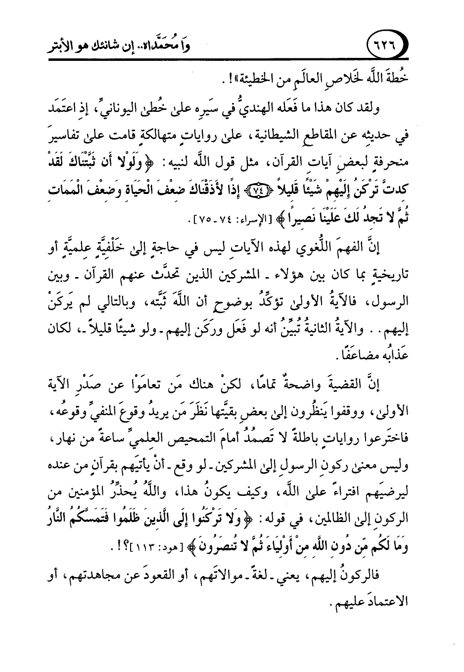 إنَّ القضيةَ واضحةٌ تمامًا، لكنْ هناك مَن تعامَوْا عن صَدْرِ الآية الأولى، ووقفوا يَنظُرون إلى بعضِ بقيَّتها نَظَرَ مَن يريدُ وقوعَ المنفيِّ وقوعُه، فاختَرعوا رواياتٍ باطلةً لا تَصمُدُ أمامَ التمحيص العِلميِّ ساعةً من نهار، وليس معنى ركونِ الرسولِ إلى المشركين -لو وقع- أنْ يأتيَهم بقرآنٍ من عنده ليرضيَهم افتراءً على الله، وكيف يكونُ هذا، واللهُ يُحذِّرُ المؤمنين من الركونِ إلى الظالمين، في قوله: {وَلَا تَرْكَنُوا إِلَى الَّذِينَ ظَلَمُوا فَتَمَسَّكُمُ النَّارُ وَمَا لَكُمْ مِنْ دُونِ اللَّهِ مِنْ أَوْلِيَاءَ ثُمَّ لَا تُنْصَرُونَ} [هود: 113]؟!.