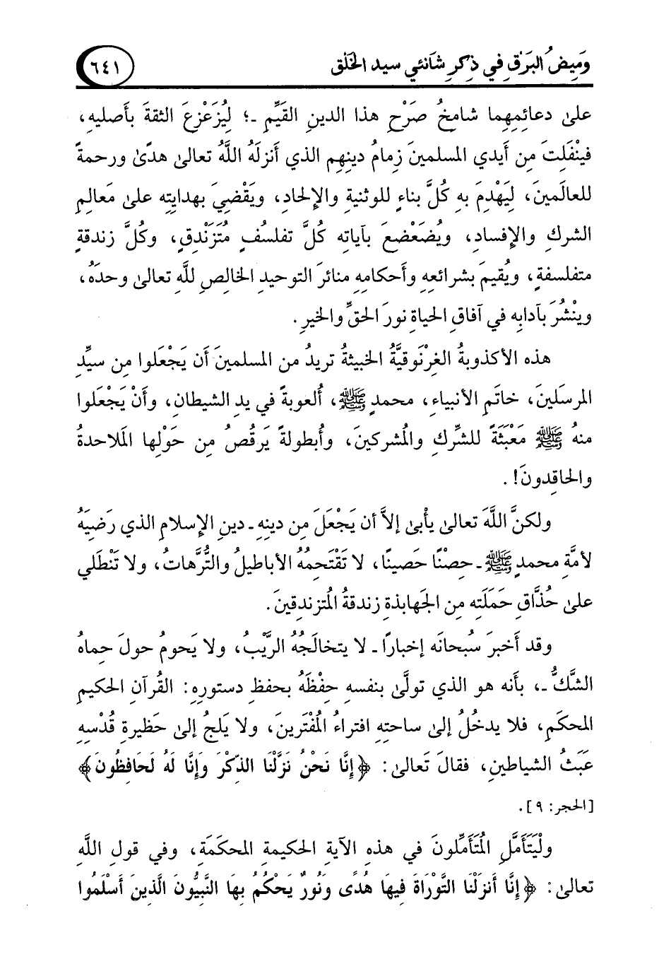 ولكنَّ اللهَ تعالى يأْبى إلَّا أن يَجْعَلَ مِن دينِهِ -دينِ الإِسلامِ الذي رَضِيَهُ لأمَّةِ محمدٍ - صلى الله عليه وسلم - حِصْنًا حَصينًا، لا تَقْتَحِمُهُ الأباطيل والتُرَّهاتُ، ولا تَنْطَلي على حُذَّاقِ حَمَلَتِه مِن الجَهابذةِ زندقةُ المُتزندِقينَ.