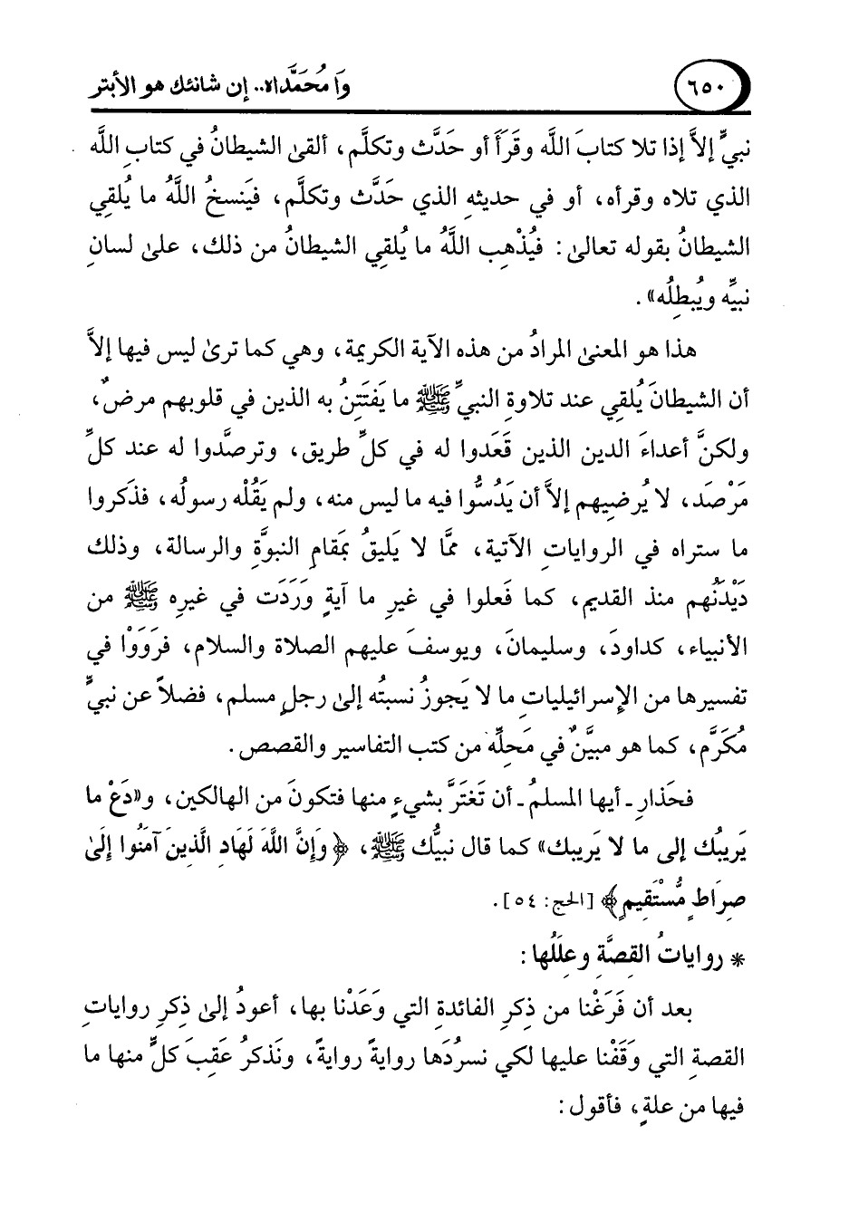 هذا هو المعنى المرادُ من هذه الآية الكريمة، وهي كما ترى ليس فيها إلَّا أن الشيطانَ يُلقِي عند تلاوةِ النبيِّ - صلى الله عليه وسلم - ما يَفتَتِنُ به الذين في قلوبهم مرضٌ، ولكنَّ أعداءَ الدين الذين قَعَدوا له في كلِّ طريق، وترصَّدوا له عند كلِّ مَرْصَد، لا يُرضِيهم إلَّا أن يَدُسُّوا فيه ما ليس منه، ولم يَقُلْه رسولُه، فذَكروا ما ستراه في الرواياتِ الآتية، ممَّا لا يَليقُ بمَقامِ النبوَّةِ والرسالة، وذلك دَيْدَنُهم منذ القديم، كما فَعلوا في غيرِ ما آيةٍ وَرَدَت في غيرِه - صلى الله عليه وسلم - من الأنبياء، كداودَ، وسليمانَ، ويوسفَ عليهم الصلاة والسلام، فرَوَوْا في تفسيرها من الإسرائيلياتِ ما لا يَجوزُ نسبتُه إلى رجلٍ مسلم، فضلاً عن نبيٍّ مُكَرَّم، كما هو مبيَّنٌ في مَحِلِّه من كتب التفاسير والقصص.