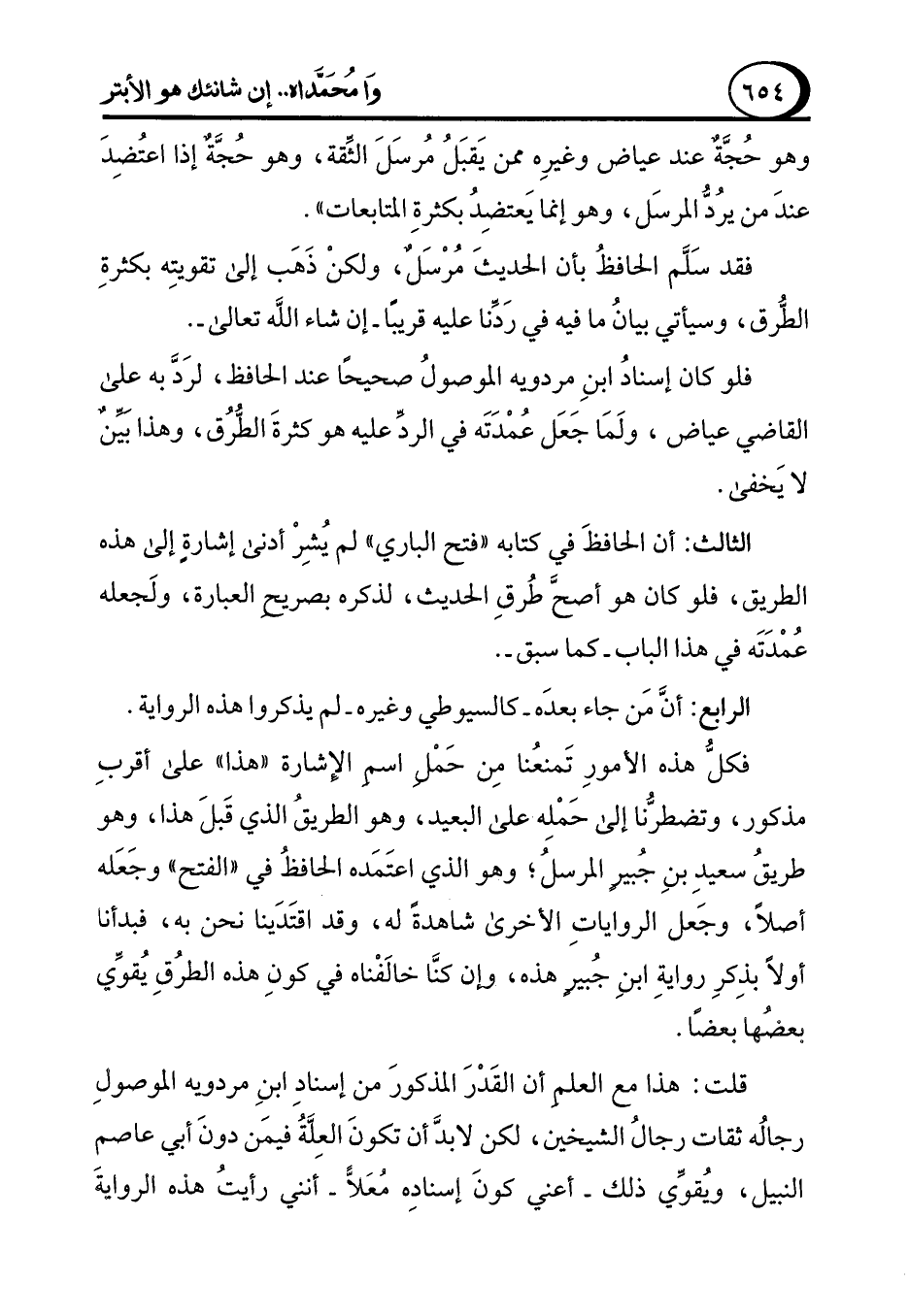 فلو كان إسنادُ ابنِ مردويه الموصولُ صحيحًا عند الحافظ، لرَدَّ به على القاضي عياض، ولَمَا جَعَل عُمْدَتَه في الردِّ عليه هو كثرةَ الطُّرُق، وهذا بَيِّنٌ لا يَخفى.