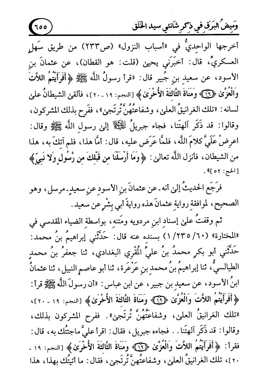 أخرجها الواحِديُّ في "أسباب النزول" (ص 233) من طريق سَهلٍ العسكريِّ، قال: أخبَرَني يحيى (قلت: هو القطان)، عن عثمانَ بنِ الأسود، عن سعيدِ بنِ جُبير قال: "قرأ رسولُ الله - صلى الله عليه وسلم - {أَفَرَأَيْتُمُ اللَّاتَ وَالْعُزَّى (19) وَمَنَاةَ الثَّالِثَةَ الْأُخْرَى} [النجم: 19 - 20]، فألقى الشيطانُ على لسانه: "تلك الغرانيقُ العلى، وشفاعتُهُنَّ تُرتَجى"، ففَرح بذلك المشركون، وقالوا: قد ذَكَر آلهتَنا، فجاء جبريل - عليه السلام - إلى رسولِ الله - صلى الله عليه وسلم - وقال: اعرِضْ عَلَيَّ كلامَ الله، فلمَّا عَرَض عليه، قال: أمَّا هذا، فلم آتِكَ به، هذا من الشيطان، فأنزل الله تعالى: {وَمَا أَرْسَلْنَا مِنْ قَبْلِكَ مِنْ رَسُولٍ وَلَا نَبِيٍّ} [الحج: 52] ".