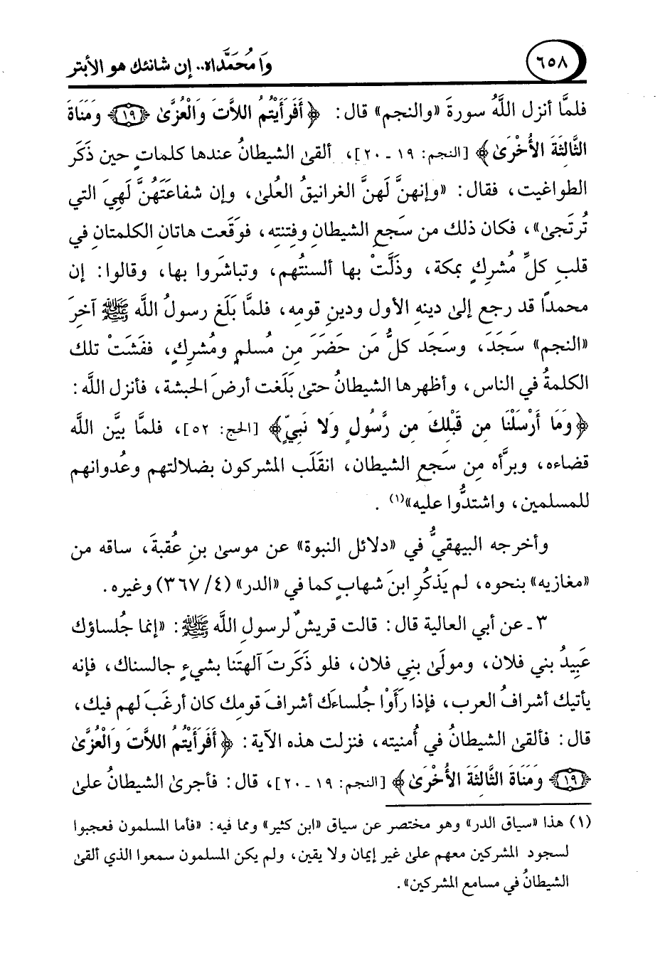 (¬1) هذا "سياق الدر" وهو مختصر عن سياق "ابن كثير" ومما فيه: "فأما المسلمون فعجبوا لسجود المشركين معهم على غير إيمان ولا يقين، ولم يكن المسلمون سمعوا الذي ألقى الشيطانُ في مسامع المشركين".