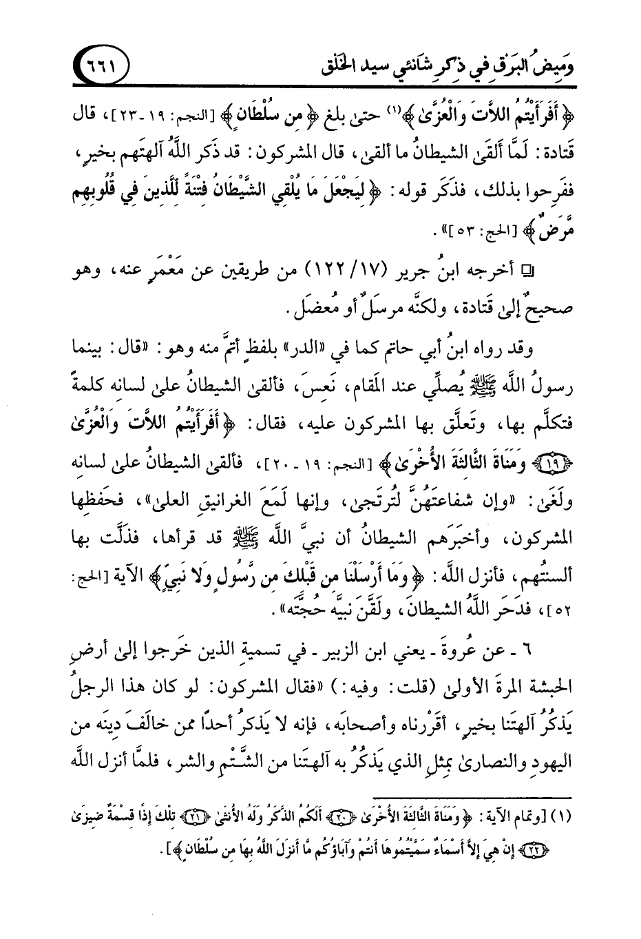 وقد رواه ابنُ أبي حاتم كما في "الدر" بلفظٍ أتمَّ منه وهو: "قال: بينما رسولُ الله - صلى الله عليه وسلم - يُصلِّي عند المَقام، نَعِسَ، فألقى الشيطان على لسانِه كلمةً فتكلَّم بها، وتَعلَّق بها المشركون عليه، فقال: {أَفَرَأَيْتُمُ اللَّاتَ وَالْعُزَّى (19) وَمَنَاةَ الثَّالِثَةَ الْأُخْرَى} [النجم: 19 - 20]، فألقى الشيطانُ على لسانِه ولَغَى: "وإن شفاعتَهُنَّ لتُرتَجى، وإنها لَمَعَ الغرانيقِ العلى"، فحَفظِها المشركون، وأخبَرَهم الشيطانُ أن نبيَّ الله - صلى الله عليه وسلم - قد قرأها، فذَلَّت بها ألسنتُهم، فأنزل الله: {وَمَا أَرْسَلْنَا مِنْ قَبْلِكَ مِنْ رَسُولٍ وَلَا نَبِيٍّ} الآية [الحج: 52]، فدَحَر الله الشيطانَ، ولَقَّنَ نبيَّه حُجَّتَه".