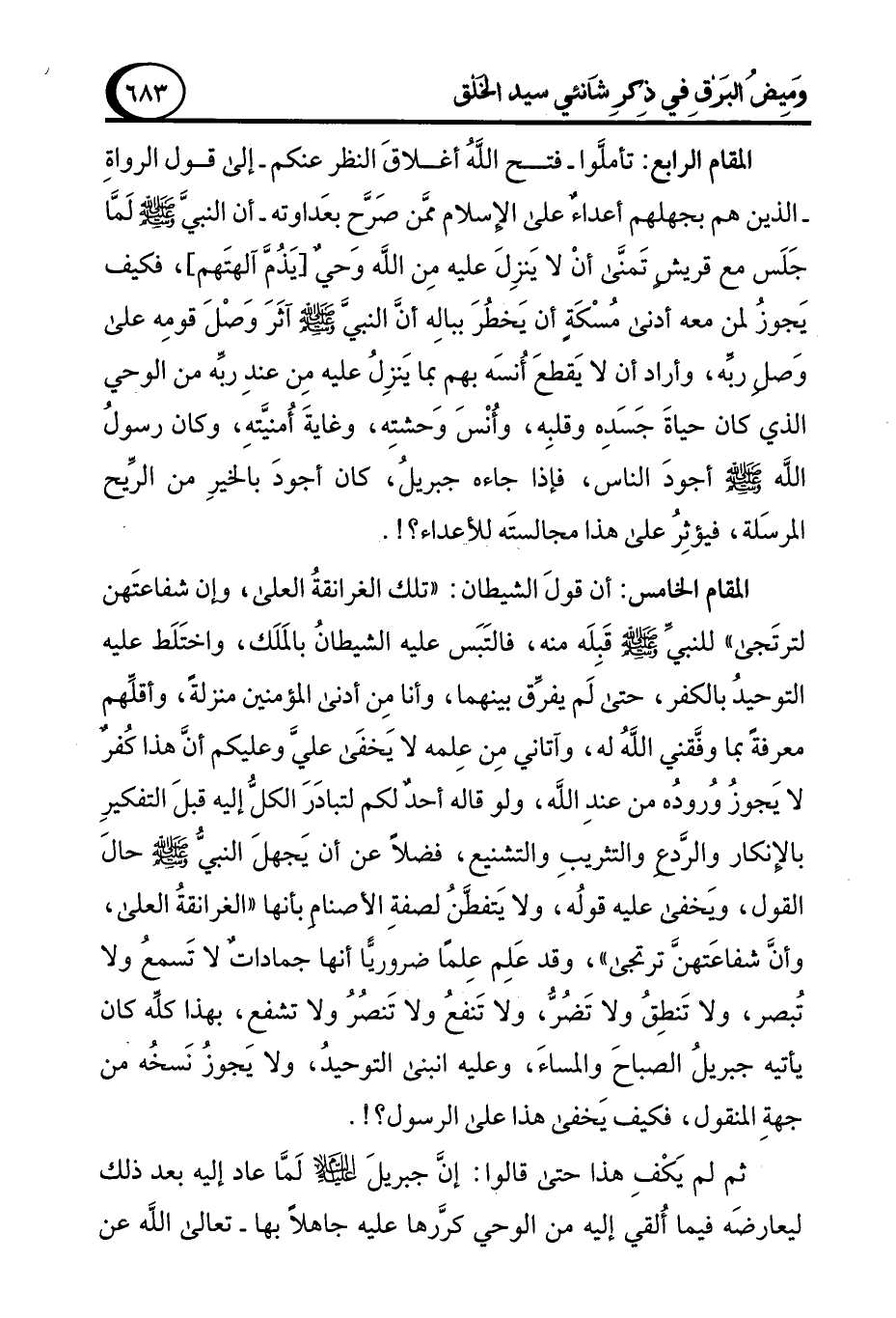 المقام الخامس: أن قولَ الشيطان: "تلك الغرانقةُ العلى، وإن شفاعتَهن لترتَجى" للنبيِّ - صلى الله عليه وسلم - قَبِلَه منه، فالتَبَس عليه الشيطانُ بالمَلَك، واختَلَط عليه التوحيدُ بالكفر، حتى لَم يفرِّق بينهما، وأنا مِن أدنى المؤمنين منزلةً، وأقلِّهم معرفةً بما وفَّقني اللهُ له، وآتاني مِن عِلمه لا يَخفَى عليَّ وعليكم أنَّ هذا كُفرٌ لا يَجوزُ وُرودُه من عندِ الله، ولو قاله أحدٌ لكم لتبادَرَ الكلُّ إليه قبلَ التفكيرِ بالإنكار والرَّدع والتثريبِ والتشنيع، فضلاً عن أن يَجهلَ النبيُّ - صلى الله عليه وسلم - حالَ القول، ويَخفى عليه قولُه، ولا يَتفطَّنُ لصفةِ الأصنام بأنها "الغرانقةُ العلى، وأنَّ شفاعَتهنَّ ترتجى"، وقد عَلِم عِلمًا ضروريًّا أنها جماداتٌ لا تَسمعُ ولا تُبصر، ولا تَنطِقُ ولا تَضُرُّ، ولا تَنفعُ ولا تَنصُرُ ولا تشفع، بهذا كلِّه كان يأتيه جبريلُ الصباحَ والمساءَ، وعليه انبنى التوحيدُ، ولا يجوزُ نسخُه من جهةِ المنقول، فكيف يَخفى هذا على الرسول؟!.