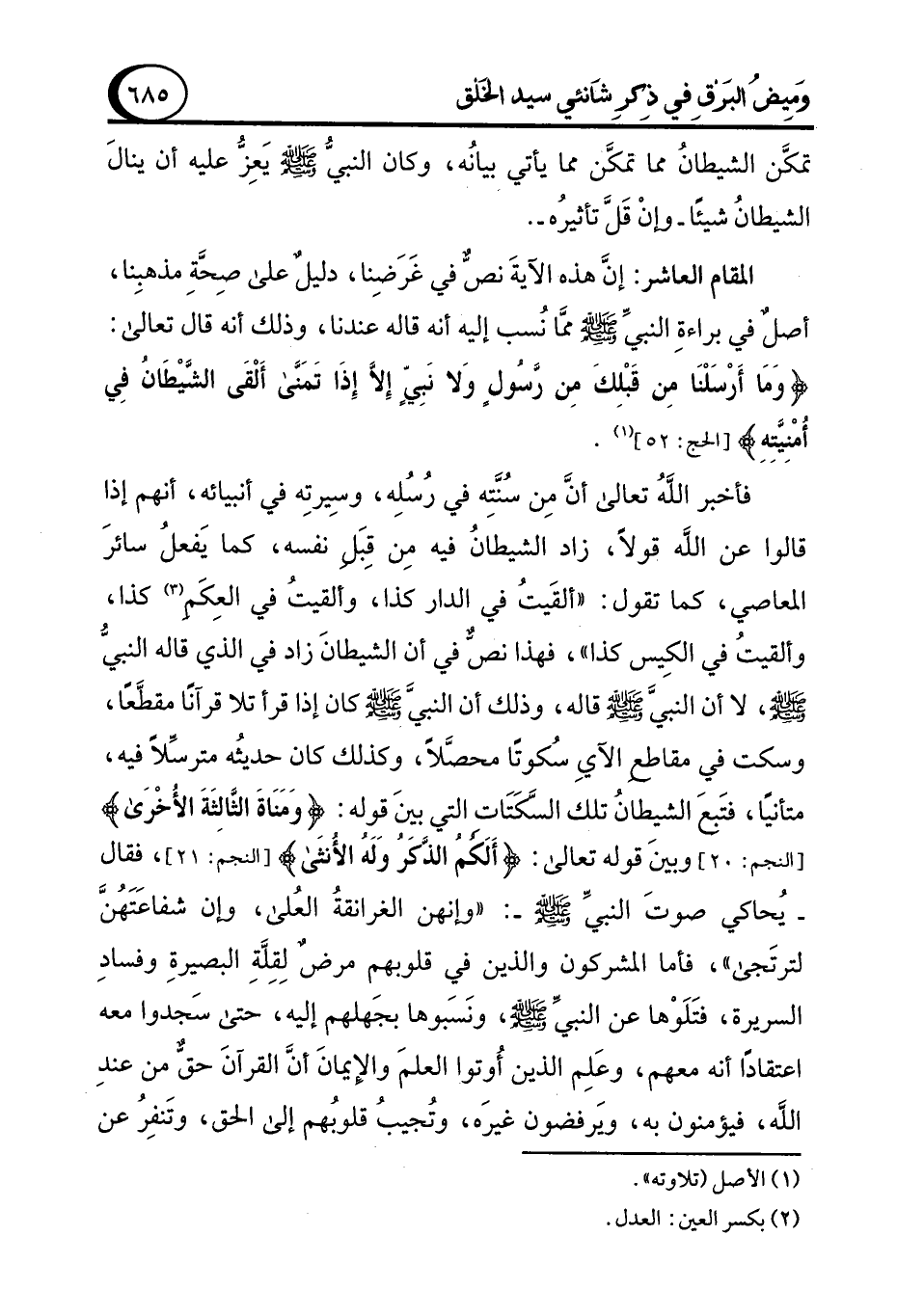 المقام العاشر: إنَّ هذه الآيةَ نصٌّ في غَرَضِنا، دليلٌ على صِحَّةِ مذهبِنا، أصلٌ في براءةِ النبيِّ - صلى الله عليه وسلم - ممَّا نُسب إليه أنه قاله عندنا، وذلك أنه قال تعالى: {وَمَا أَرْسَلْنَا مِنْ قَبْلِكَ مِنْ رَسُولٍ وَلَا نَبِيٍّ إِلَّا إِذَا تَمَنَّى أَلْقَى الشَّيْطَانُ فِي أُمْنِيَّتِهِ} [الحج: 52] (¬1).