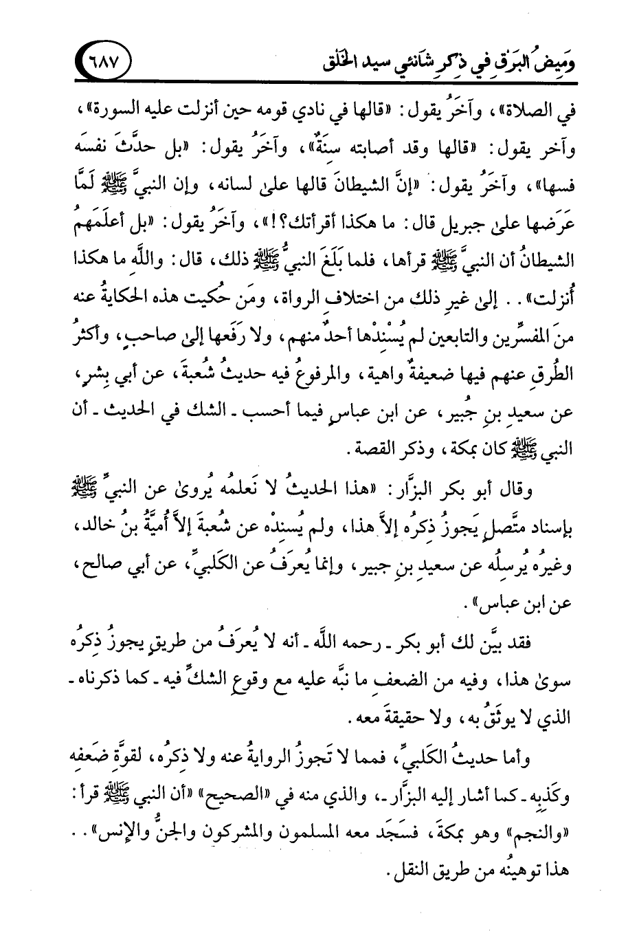 في الصلاة"، وآخَرُ يقول: "قالها في نادي قومه حين أنزلت عليه السورة"، وآخر يقول: "قالها وقد أصابته سِنَةٌ"، وآخَرُ يقول: "بل حدَّثَ نفسَه فسها"، وآخَرُ يقول: "إنَّ الشيطانَ قالها على لسانه، وإن النبيَّ - صلى الله عليه وسلم - لَمَّا عَرَضها على جبريل قال: ما هكذا أقرأتك؟! "، وآخَرُ يقول: "بل أعلَمَهمُ الشيطانُ أن النبيَّ - صلى الله عليه وسلم - قرأها، فلما بَلَغَ النبيُّ - صلى الله عليه وسلم - ذلك، قال: واللهِ ما هكذا أُنزلت" .. إلى غيرِ ذلك من اختلافِ الرواة، ومَن حُكيت هذه الحكايةُ عنه منَ المفسِّرين والتابعين لم يُسْنِدْها أحدٌ منهم، ولا رَفَعها إلى صاحبٍ، وأكثرُ الطُرقِ عنهم فيها ضعيفةٌ واهية، والمرفوعُ فيه حديثُ شُعبةَ، عن أبي بِشرٍ، عن سعيدِ بنِ جُبير، عن ابن عباسٍ فيما أحسب -الشك في الحديث- أن النبي - صلى الله عليه وسلم - كان بمكة، وذكر القصة.