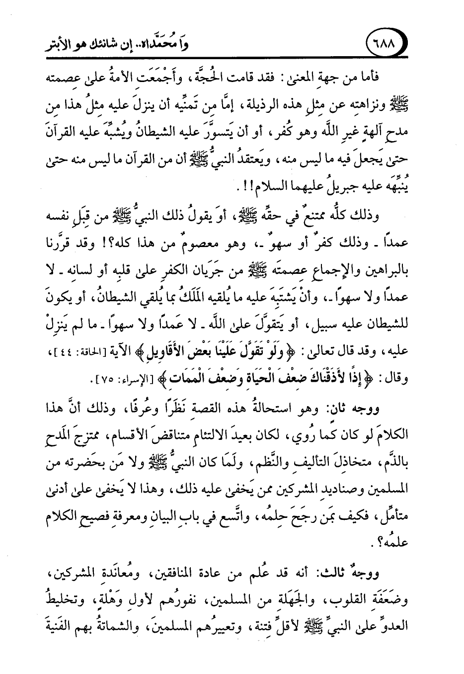 فأما من جهةِ المعنى: فقد قامت الحُجَّة، وأَجْمَعَتِ الأمةُ على عِصمته - صلى الله عليه وسلم - ونزاهتِه عن مِثلِ هذه الرذيلة، إمَّا مِن تَمنِّيه أن ينزلَ عليه مِثلُ هذا مِن مدحِ آلهةٍ غيرِ الله وهو كُفر، أو أن يَتسوَّرَ عليه الشيطانُ وُيشبِّهَ عليه القرآنَ حتى يَجعلَ فيه ما ليس منه، ويَعتقدُ النبيُّ - صلى الله عليه وسلم - أن من القرآن ما ليس منه حتى يُنبِّهَه عليه جبريلُ عليهما السلام!!.