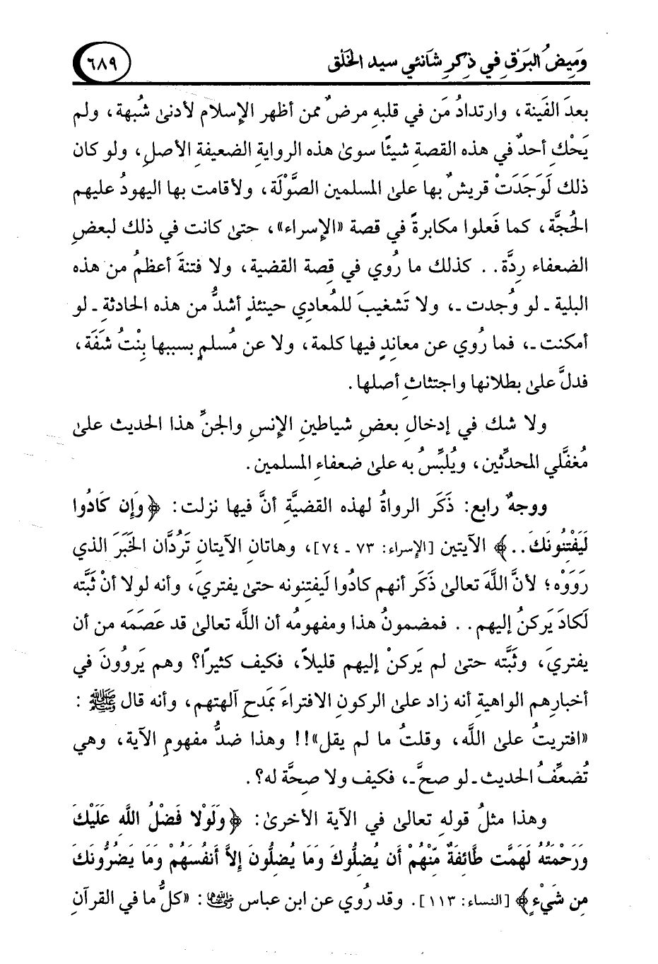 بعدَ الفَينة، وارتدادُ مَن في قلبهِ مرضٌ ممن أظهر الإِسلام لأدنى شُبهة، ولم يَحْكِ أحدٌ في هذه القصةِ شيئًا سوى هذه الروايةِ الضعيفةِ الأصلِ، ولو كان ذلك لَوَجَدَتْ قريشٌ بها على المسلمين الصَّوْلَة، ولأقامت بها اليهودُ عليهم الحُجَّة، كما فَعلوا مكابرةً في قصة "الإِسراء"، حتى كانت في ذلك لبعضِ الضعفاء رِدَّة .. كذلك ما رُوي في قِصة القضية، ولا فتنةَ أعظمُ من هذه البلية -لو وُجدت-، ولا تَشغيبَ للمُعادِي حينئذٍ أشدُّ من هذه الحادثةِ -لو أمكنت-، فما رُوي عن معانِدٍ فيها كلمة، ولا عن مُسلمٍ بسببها بِنْتُ شَفَة، فدلَّ على بطلانها واجتثاثِ أصلها.