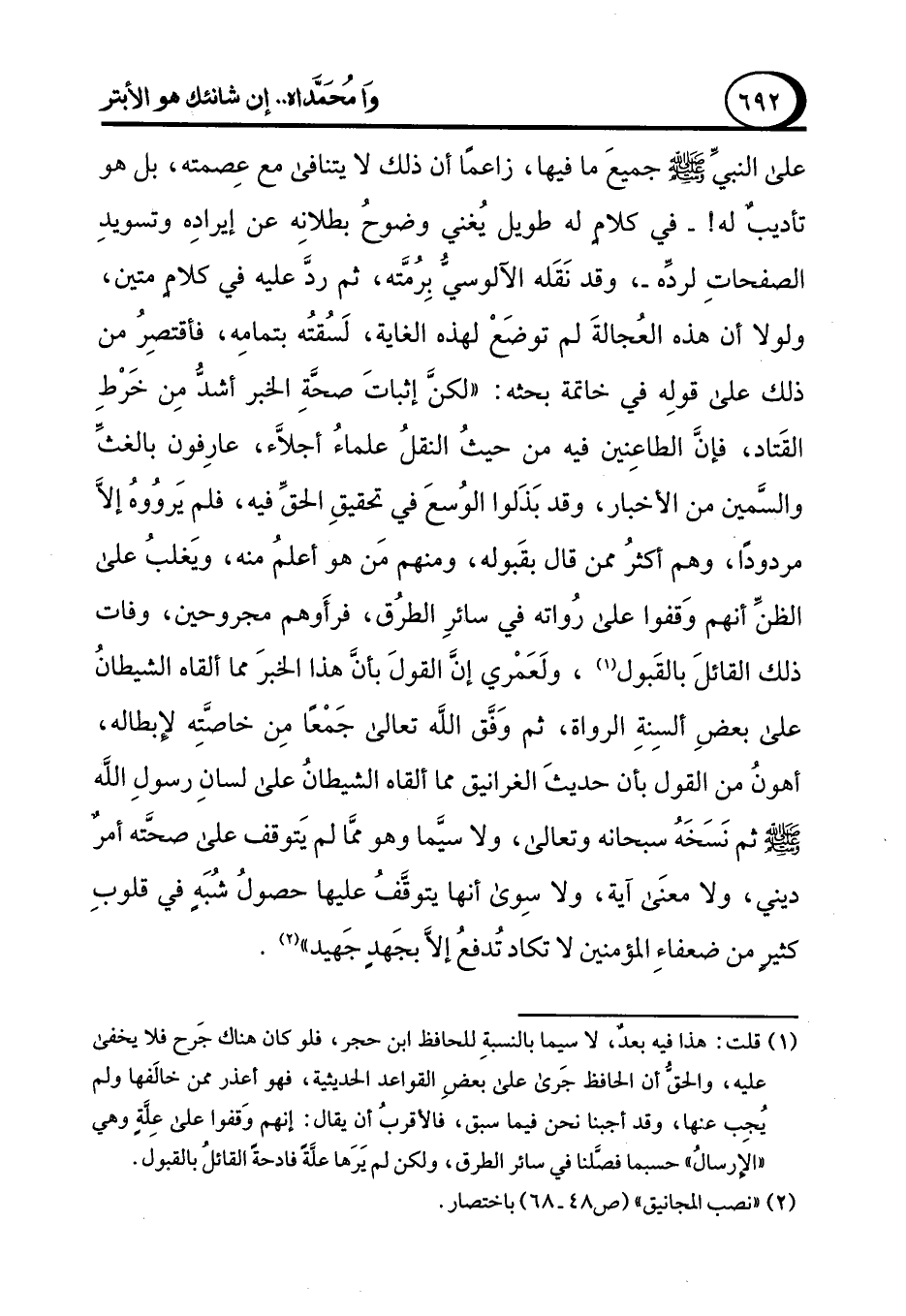 على النبيِّ - صلى الله عليه وسلم - جميعَ ما فيها، زاعمًا أن ذلك لا يتنافى مع عِصمته، بل هو تأديبٌ له! -في كلامٍ له طويل يُغني وضوحُ بطلانِه عن إيرادِه وتسويدِ الصفحاتِ لردِّه-، وقد نَقَله الآلوسيُّ بِرُمَّته، ثم ردَّ عليه في كلامٍ متين، ولولا أن هذه العُجالةَ لم توضَعْ لهذه الغاية، لَسُقتُه بتمامِه، فأقتصِرُ من ذلك على قولِه في خاتمة بحثه: "لكنَّ إثباتَ صحَّةِ الخبر أشدُّ مِن خَرْطِ القَتاد، فإنَّ الطاعِنين فيه من حيثُ النقلُ علماءُ أجلَّاء، عارِفون بالغثِّ والسَّمين من الأخبار، وقد بَذَلوا الوُسعَ في تحقيقِ الحقِّ فيه، فلم يَروُوهُ إلَّا مردودًا، وهم أكثرُ ممن قال بقَبوله، ومنهم مَن هو أعلمُ منه، ويَغلبُ على الظنِّ أنهم وَقفوا على رُواته في سائرِ الطُرق، فرأَوهم مجروحين، وفات ذلك القائلَ بالقَبول (¬1)، ولَعَمْري إنَّ القولَ بأنَّ هذا الخبرَ مما ألقاه الشيطانُ على بعضِ ألسِنةِ الرواة، ثم وَفَّق الله تعالى جَمْعًا مِن خاصَّتِه لإبطاله، أهونُ من القول بأن حديثَ الغرانيق مما ألقاه الشيطانُ على لسانِ رسولِ الله - صلى الله عليه وسلم - ثم نَسَخَهُ سبحانه وتعالى، ولا سيَّما وهو ممَّا لم يَتوقف على صحَّته أمرٌ ديني، ولا معنَى آية، ولا سِوى أنها يتوقَّفُ عليها حصولُ شُبَهٍ في قلوبِ كثيرٍ من ضعفاءِ المؤمنين لا تكاد تُدفعُ إلَّا بجَهدٍ جَهيد" (¬2).