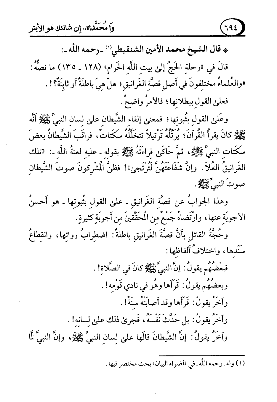 قالَ في "رحلةِ الحَجِّ إلى بيتِ اللهِ الحَرامِ" (128 - 135) ما نصُّهُ: "والعُلماءُ مختلِفونَ في أَصلِ قصَّةِ الغَرانيقِ؛ هلْ هِيَ باطلَةٌ أَو ثابِتَةٌ؟!.
