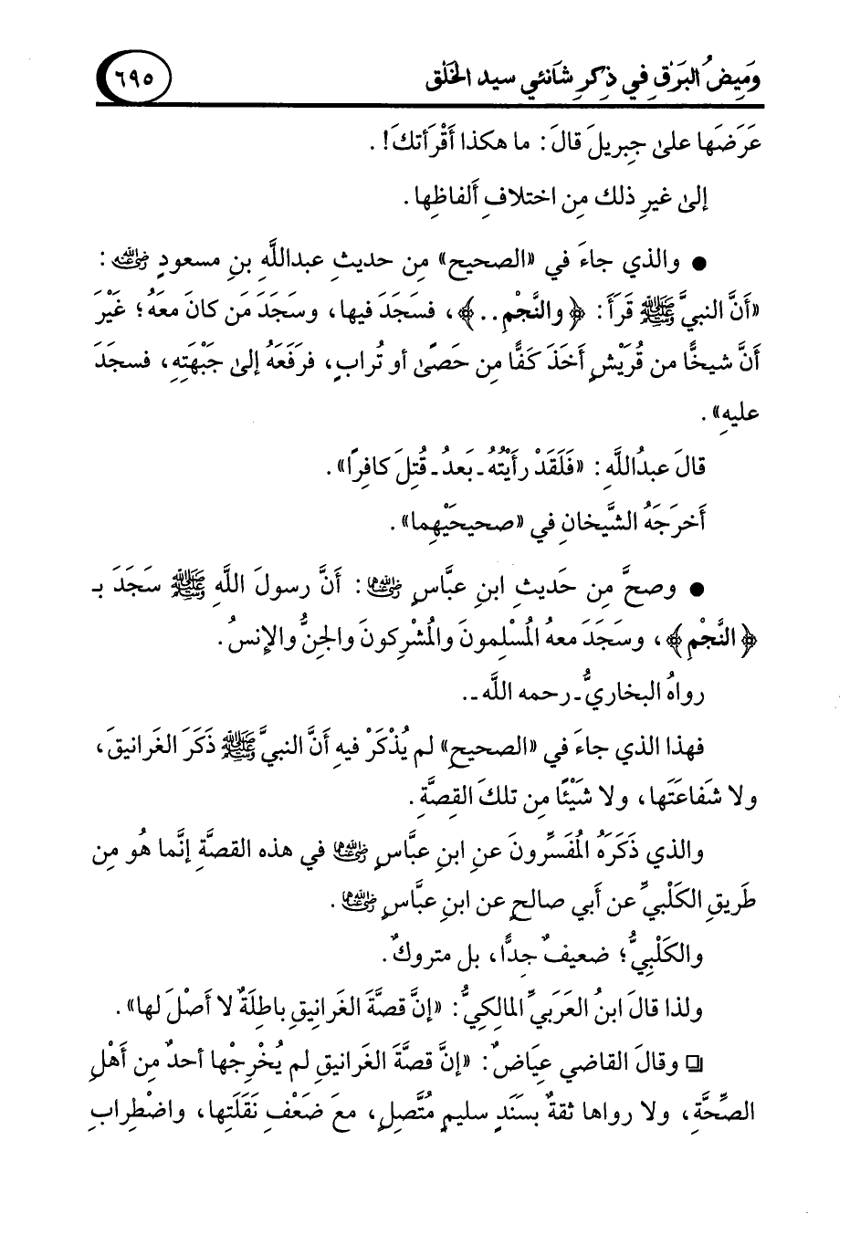 فهذا الذي جاءَ في "الصحيحِ" لم يُذْكَرْ فيهِ أَنَّ النبيَّ - صلى الله عليه وسلم - ذكَرَ الغَرانيقَ، ولا شَفاعَتَها، ولا شَيْئًا مِن تلكَ القِصَّةِ.